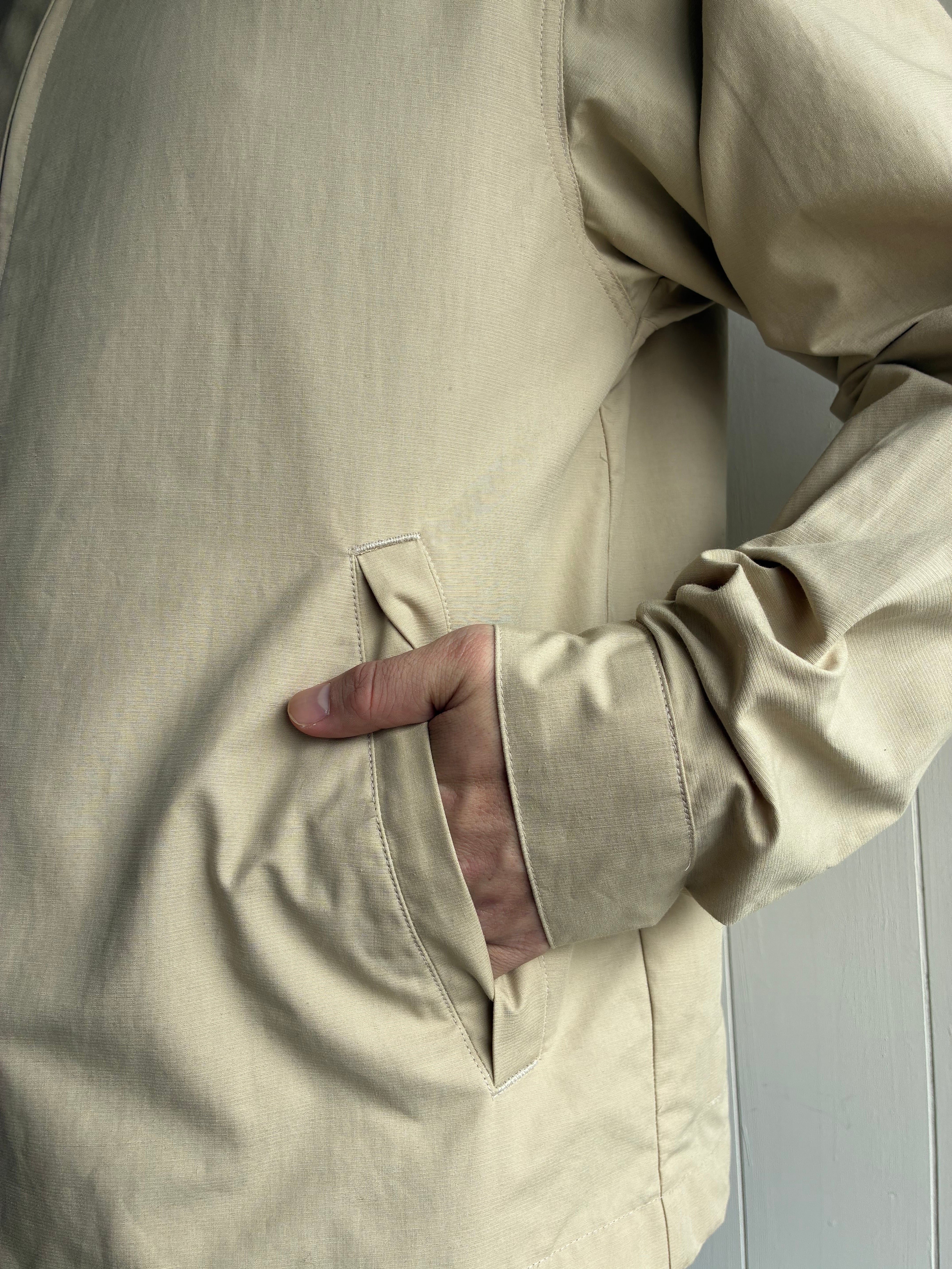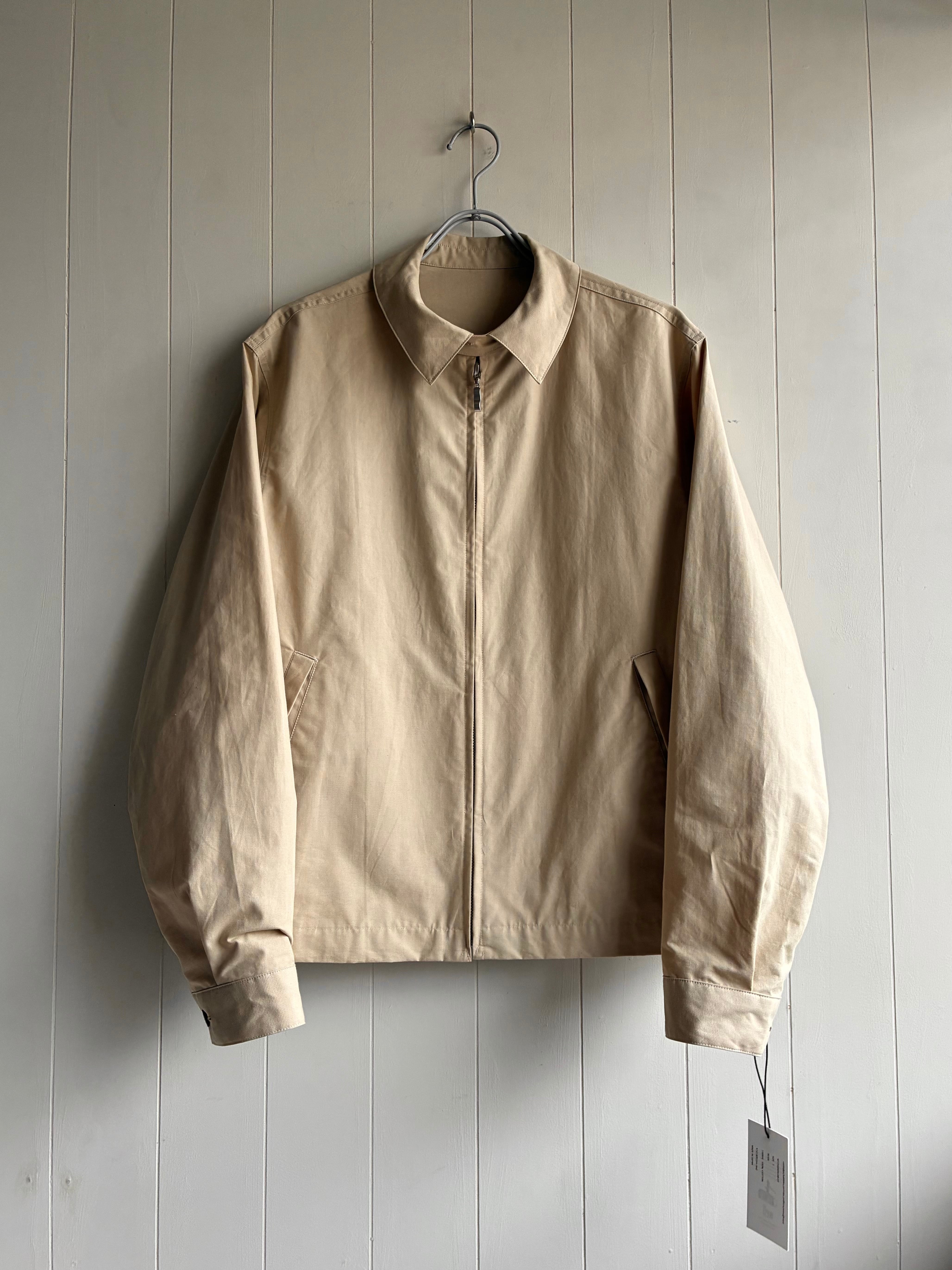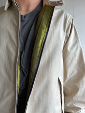 ややショート丈、リボン型の引き手チャーム,ファスナー内側身返しに配色のテープ(Blackマルチカラー、Beigeグリーン)、一枚仕立て,フロントに2つ逆玉縁ポケット、折り返し可能な台襟つき、袖口にタックとスリット、カフスつき。