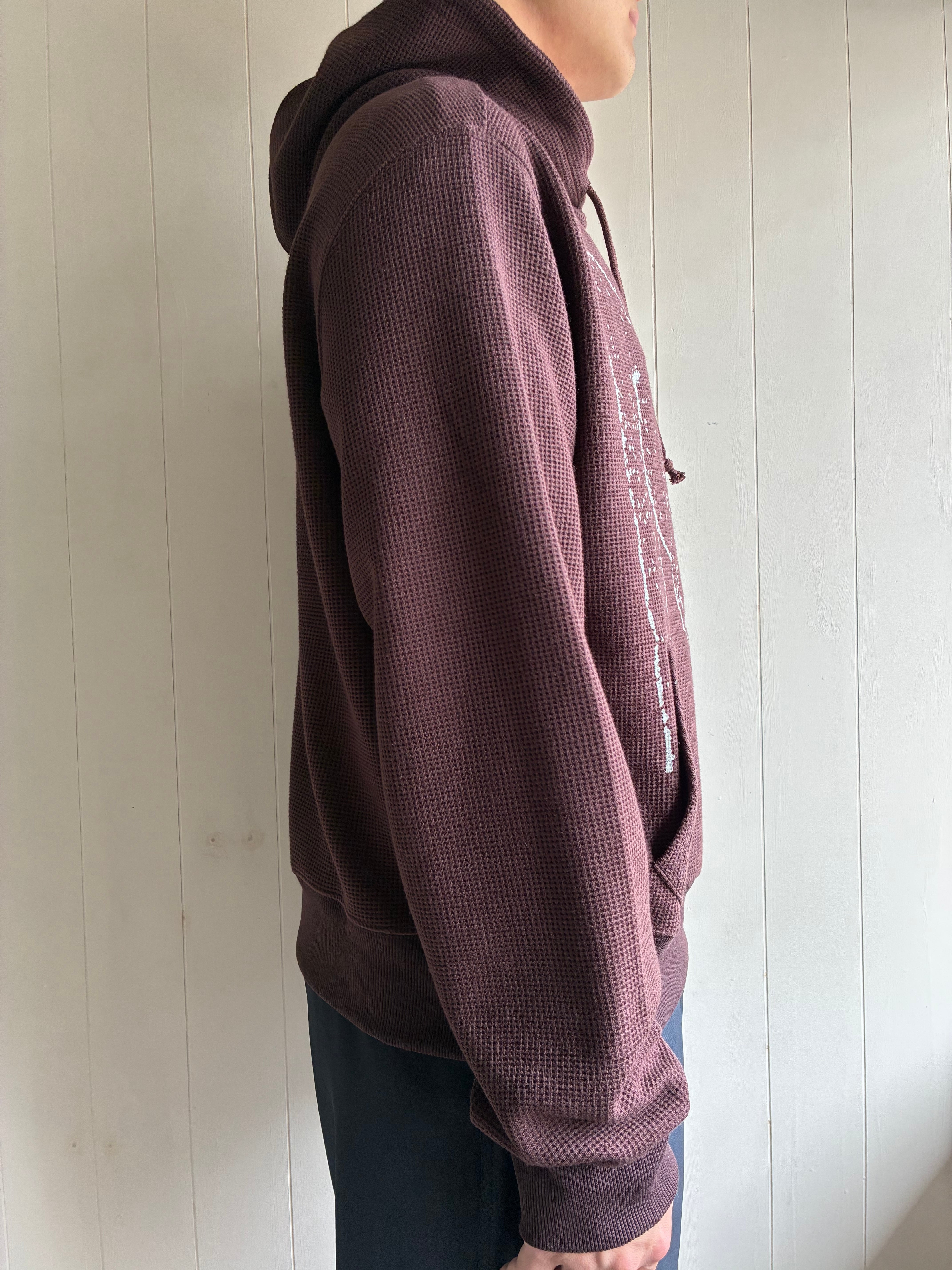ワッフル地のプルオーバーフーディ。ハンドプリントの大判グラフィックは、機械プリントには出せない繊細さとインパクトがあります。