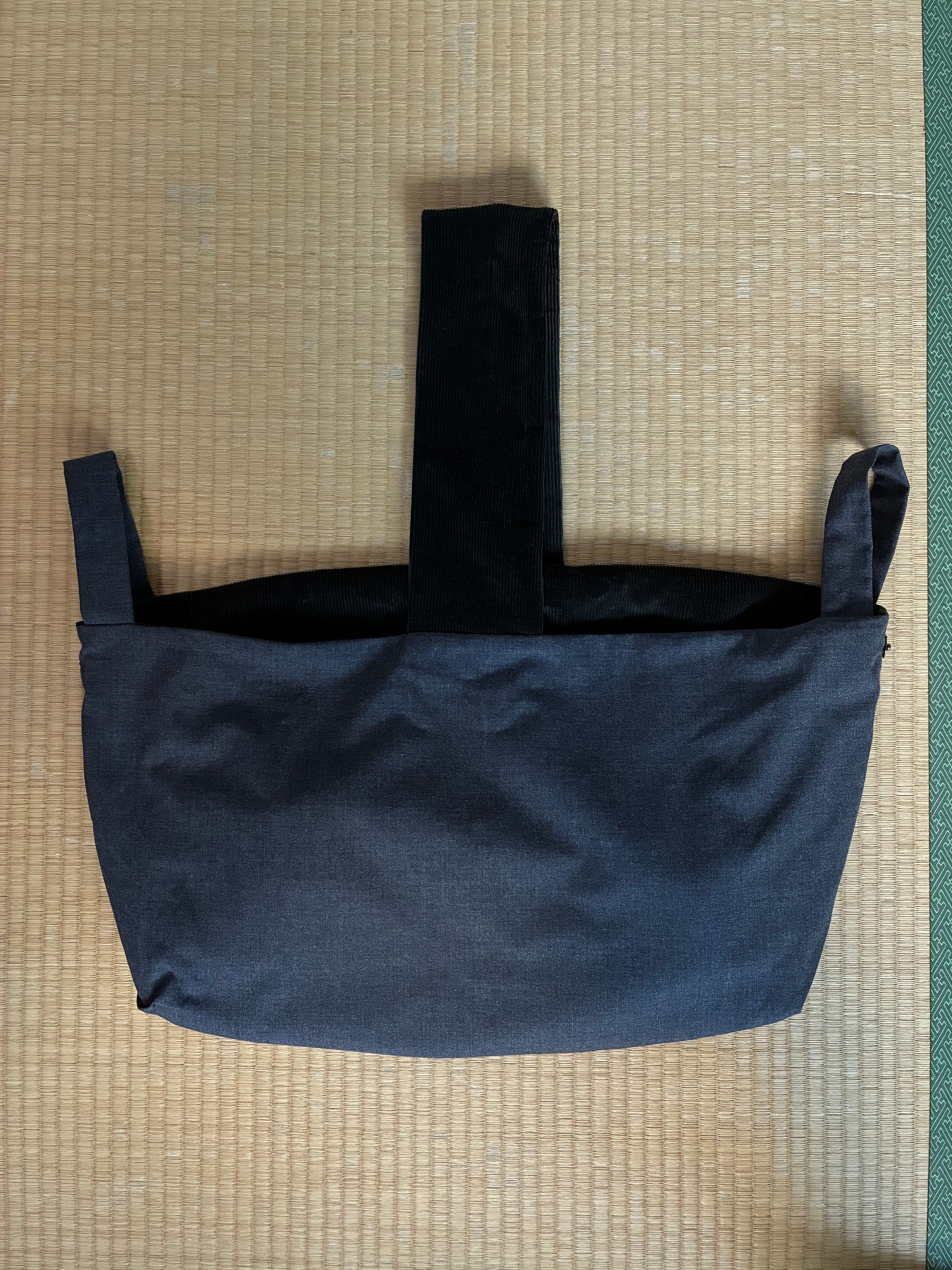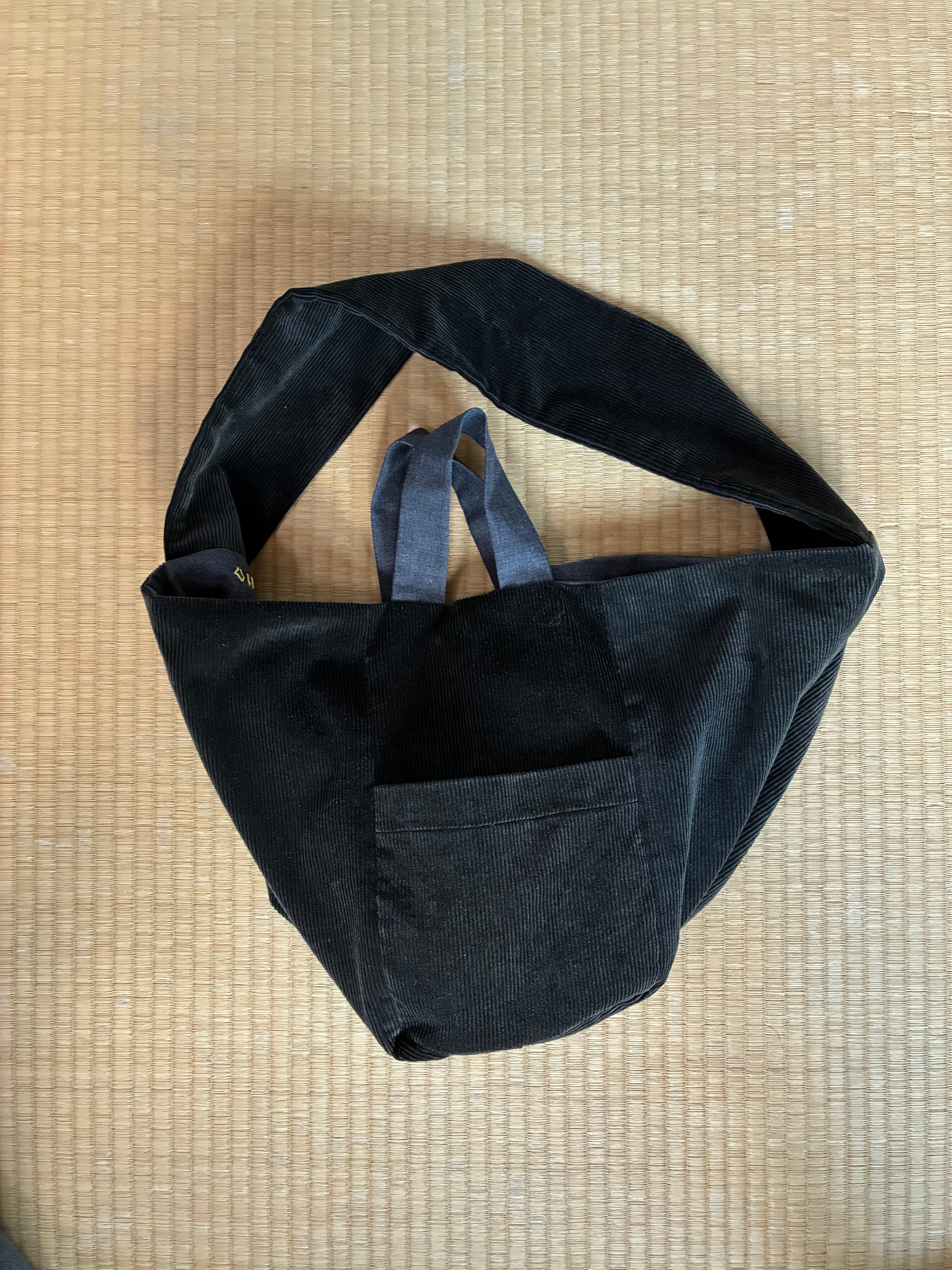 リバーシブルのメッセンジャーバッグ。静岡県天龍社産地のコーデュロイとデッドストックのヴァージンウールの切替。持ち方によって表情が変化するユニークなバッグです。