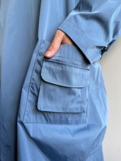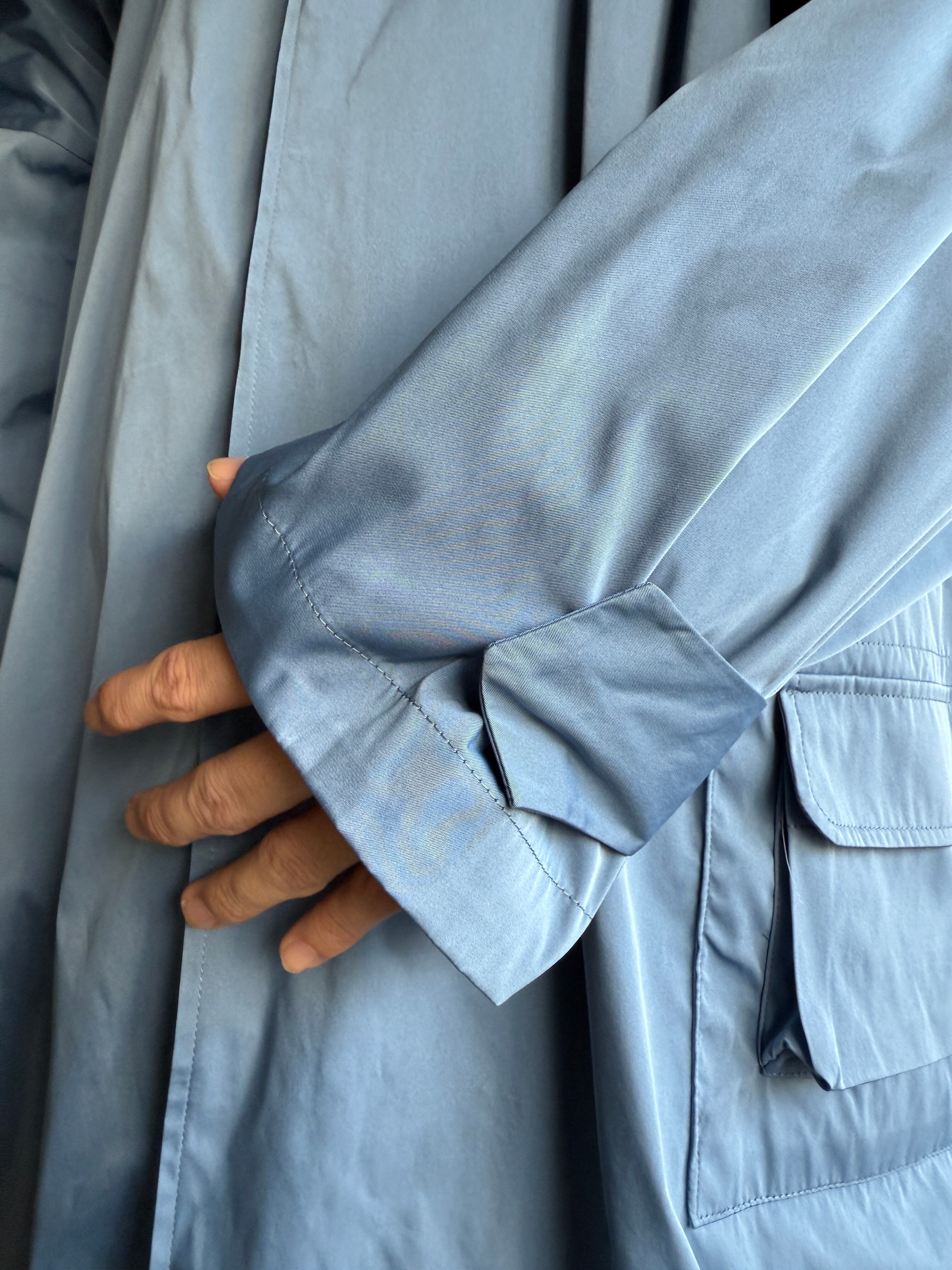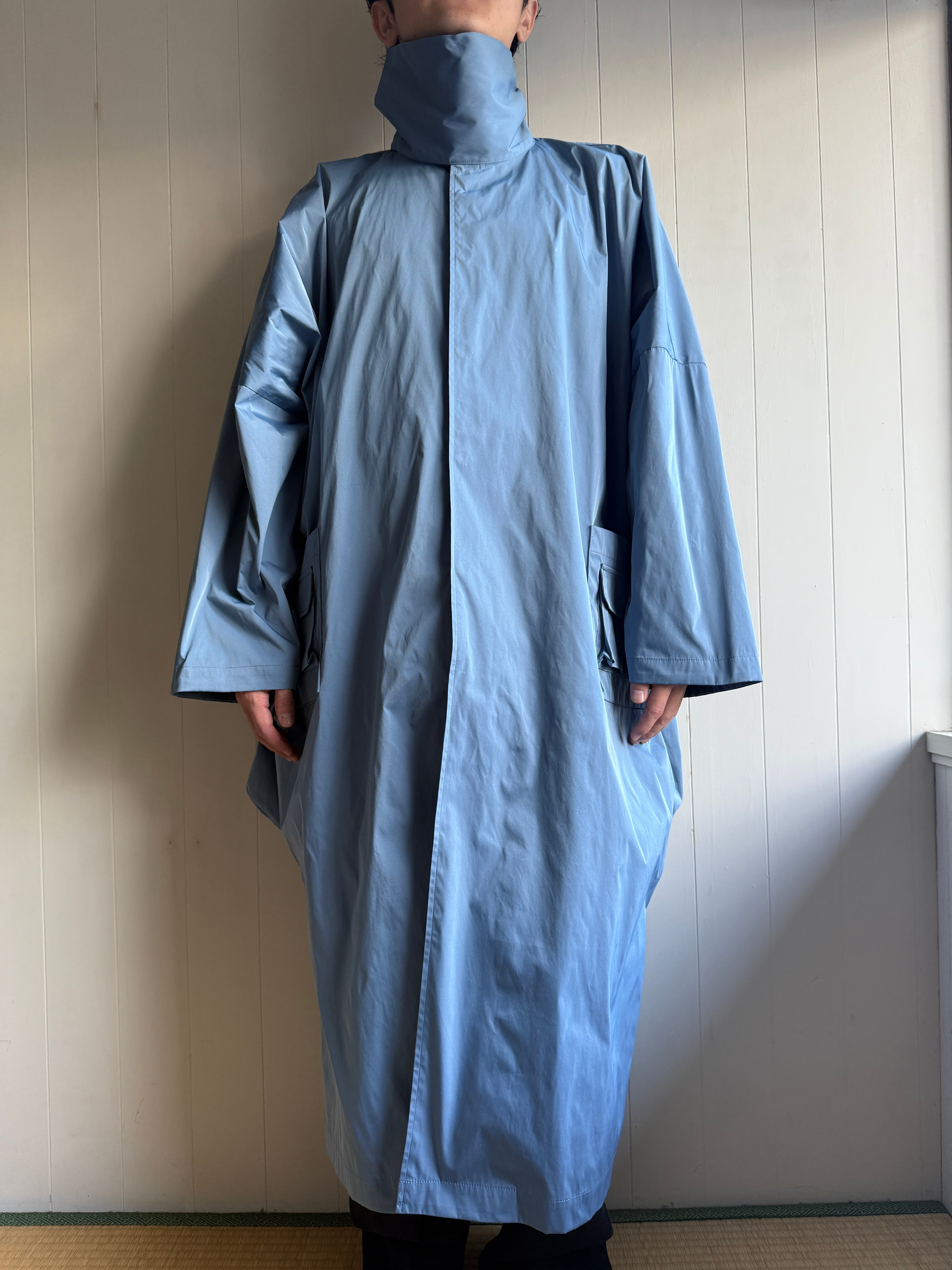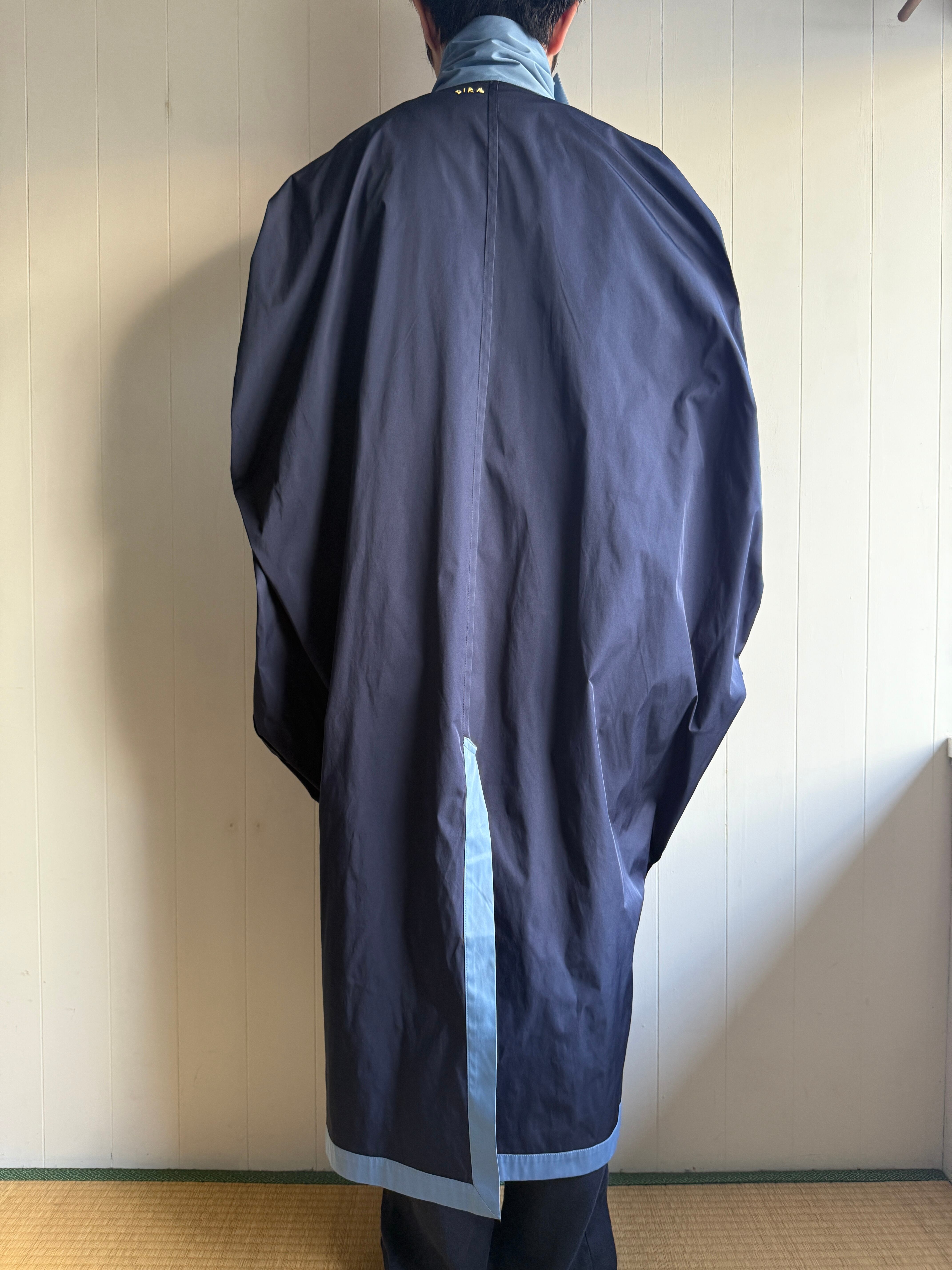 イタリア・LIMONTA社製のダブルフェイスナイロンを使ったリバーシブルコート。歪な曲線のシルエットは、本コレクションに影響を与えた映画監督デヴィット・リンチの『ERASERHEAD』に登場する頬にコブのある女から引用されています。スナップボタンで取り付けられるので、両面で着用可能です。