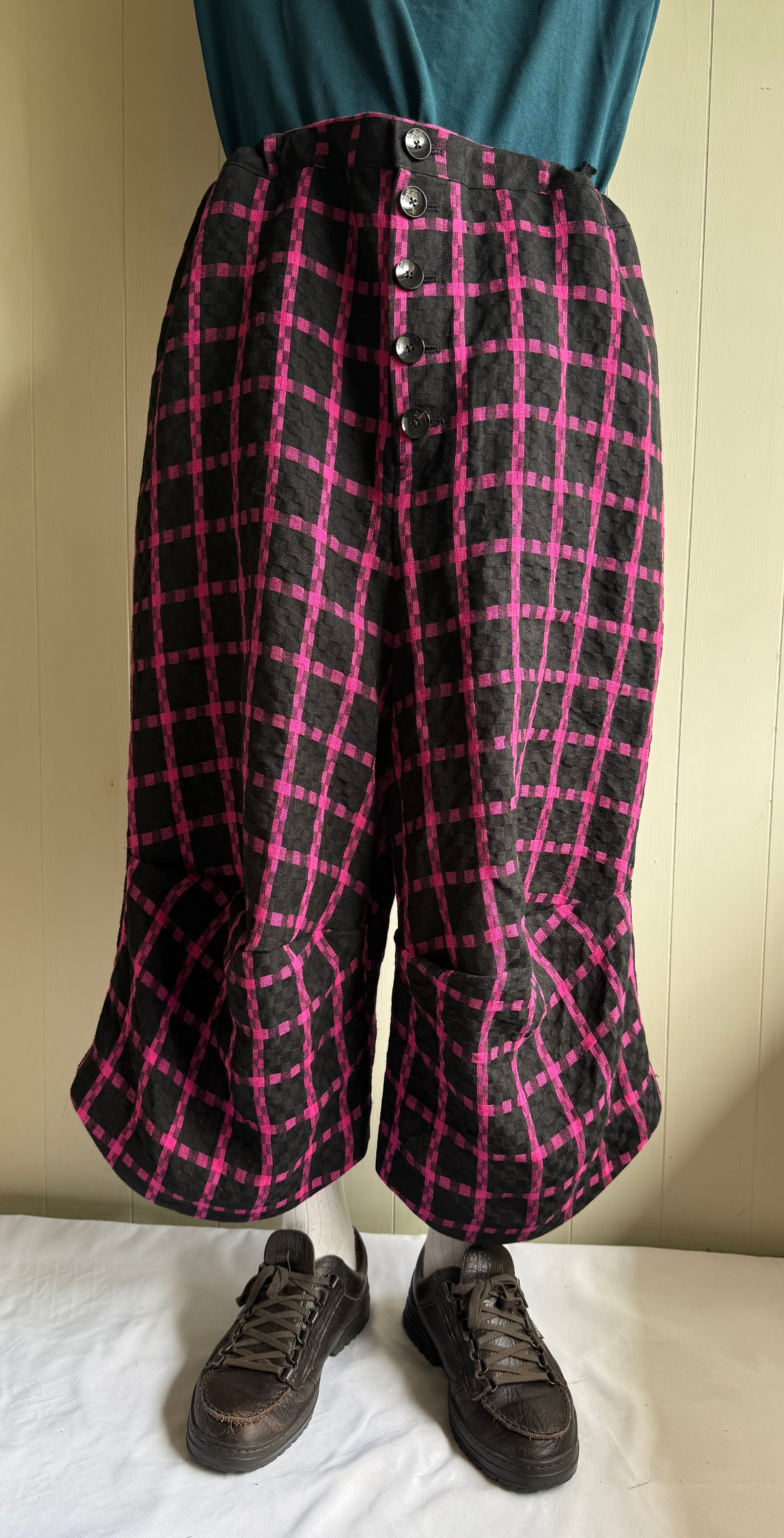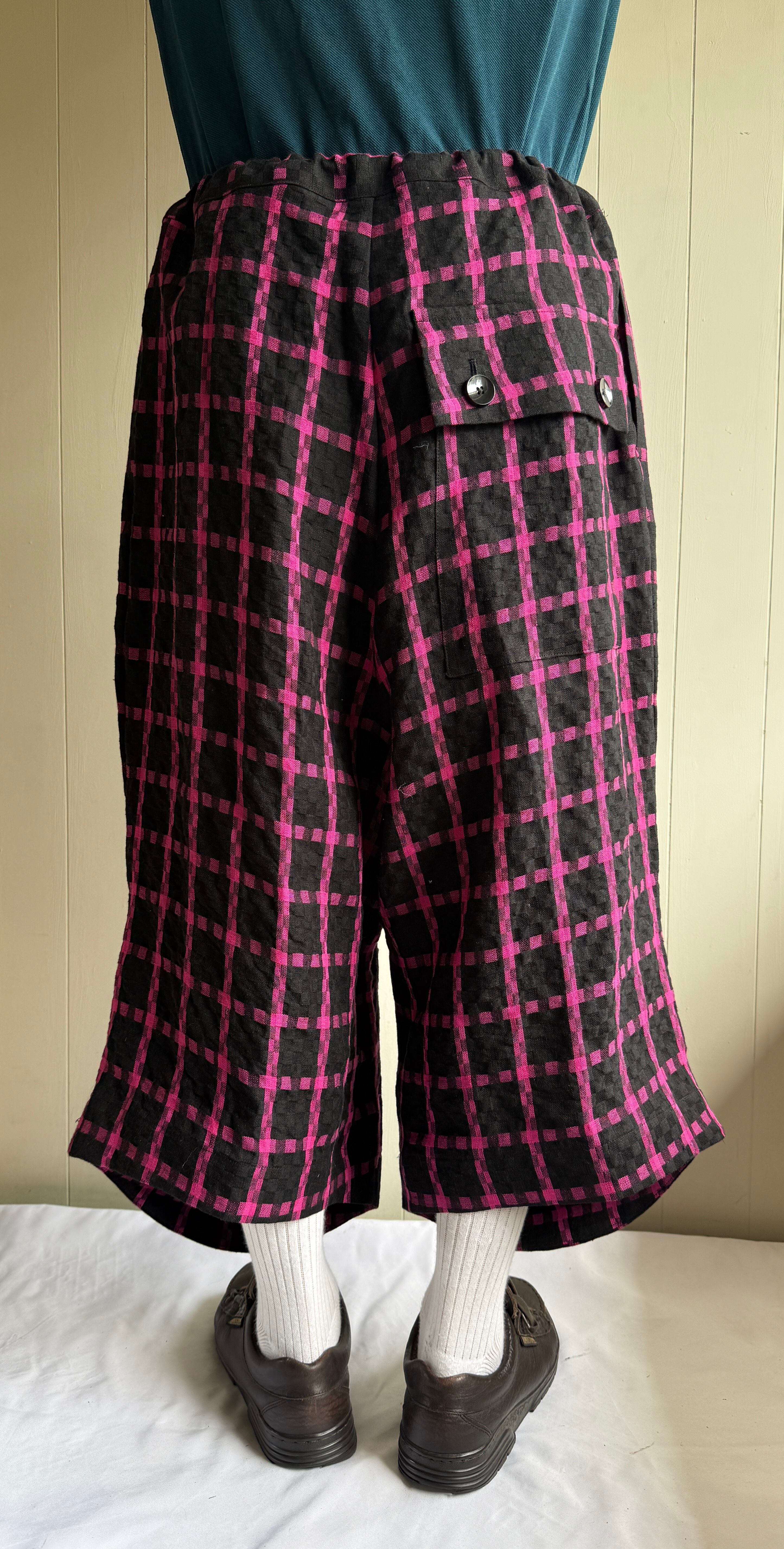 001で作ったカッケパンツから派生して、表のみ膝が出るショートパンツが作られました。7-8部丈あります。ウエストは大きく、腰の布の集め方によりシルエットが変化します。