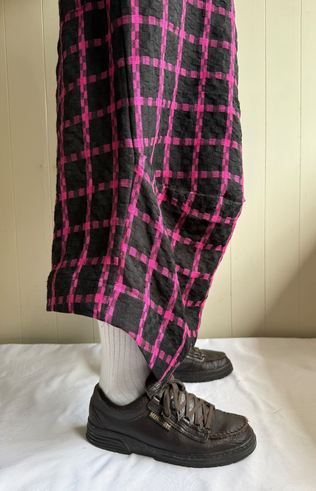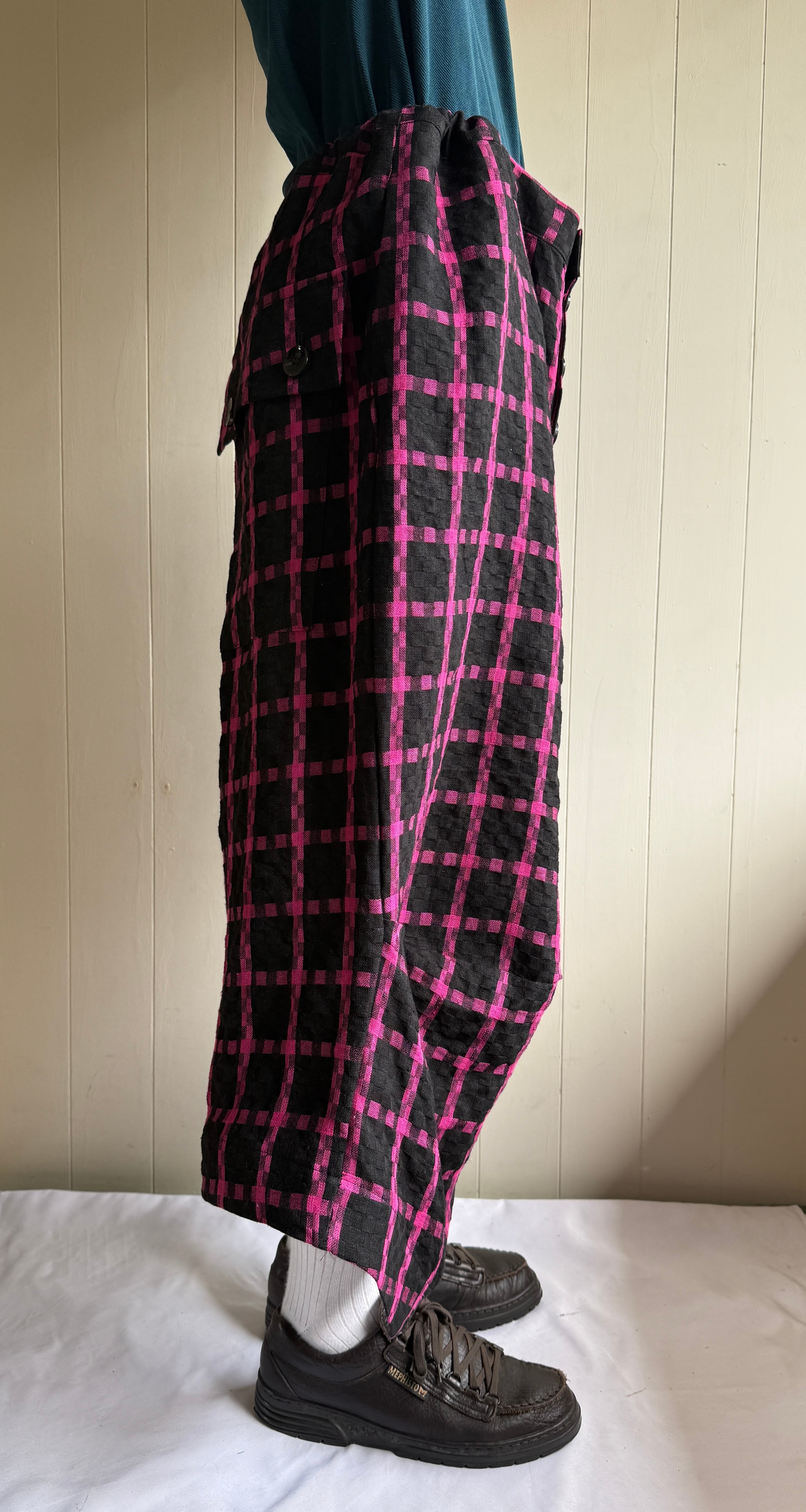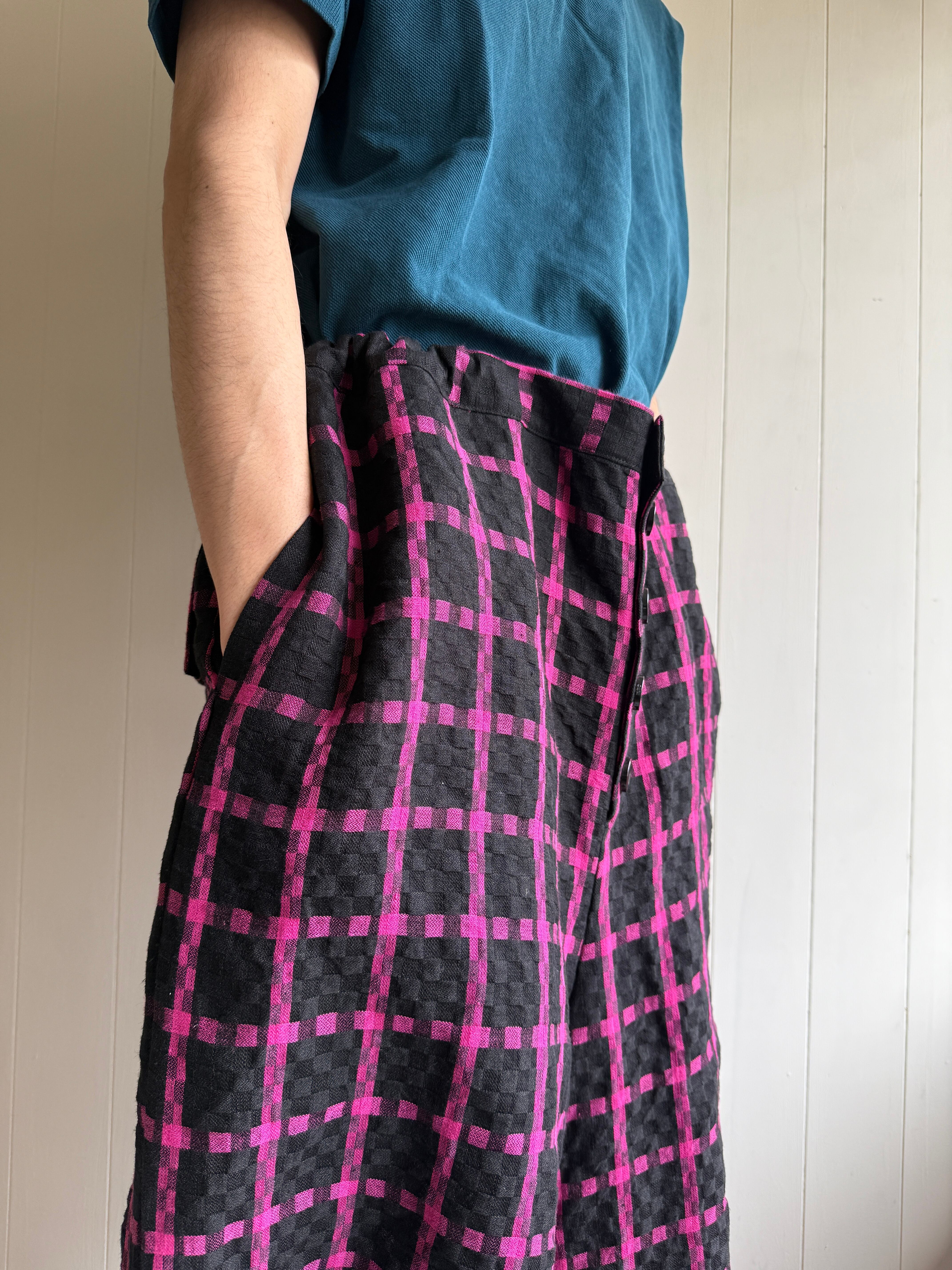 尾州で見つけた黒茶のブロックチェックに織り重なった生地から、黒ピンクに変更してもらったそうです。洗いざらした上質なリネンに、発色の良いピンクがミスマッチで、違和感のある生地になっています。リネン糸を糸状態で染め分けて、旧式の織機にてドビー織にした後、洗いをかけることにより織模様が更に立体感が増しつつも、リネンの特徴であるハリ感を際立たせた素材です。