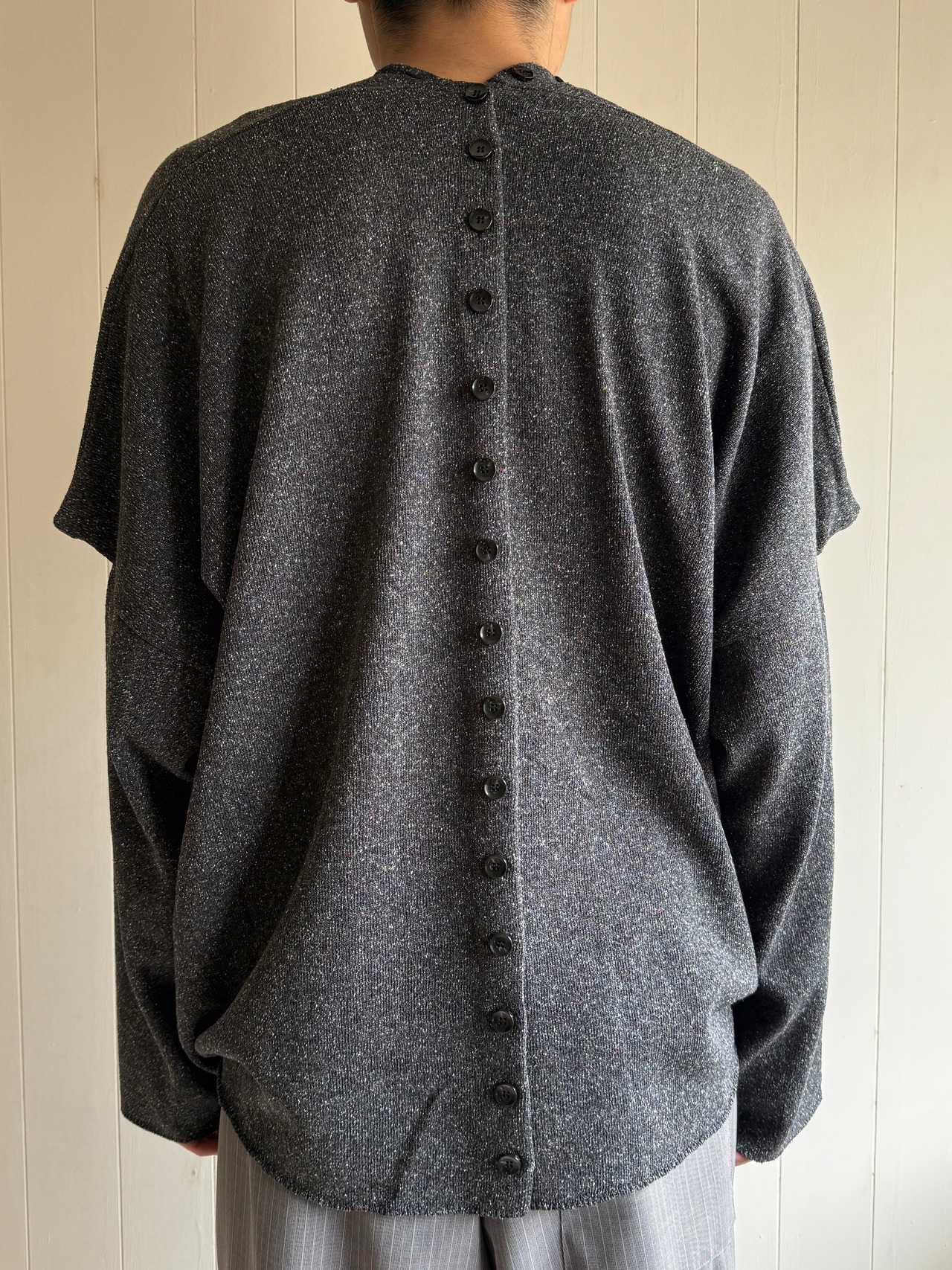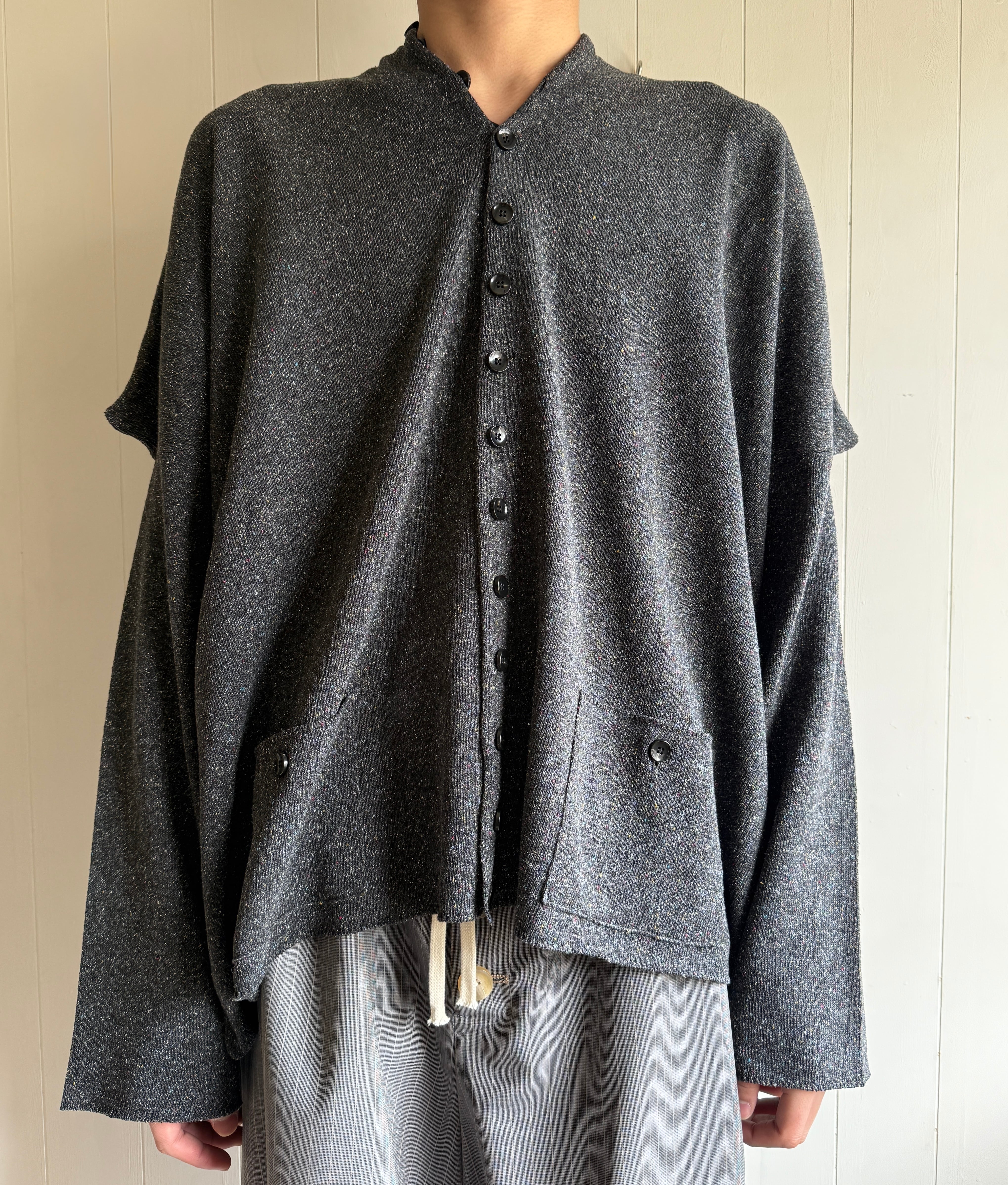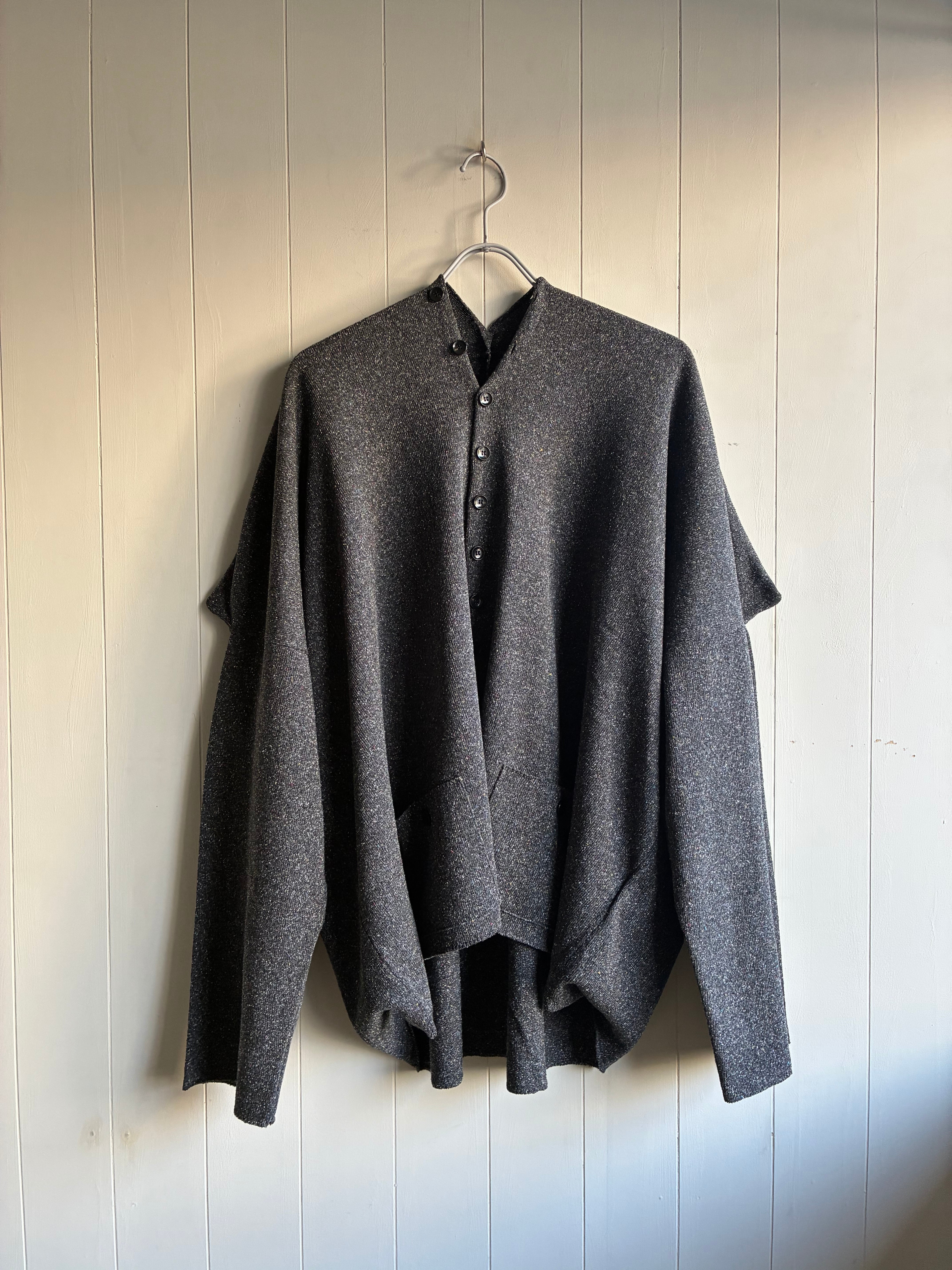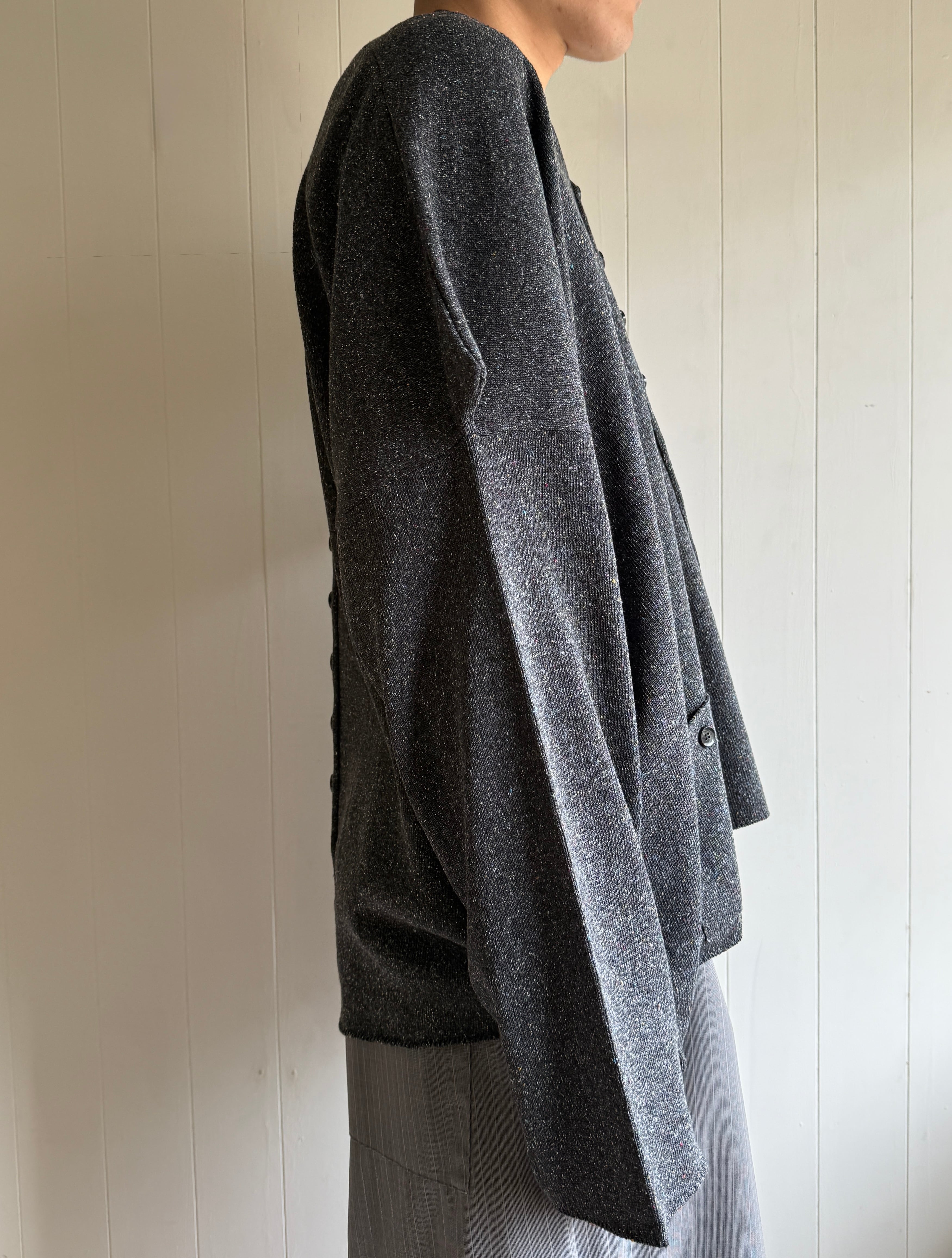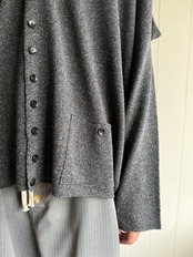 名前の通りボックスの形をしているカーディガンです。袖が肩の少し下に付いているので少し肩が尖った角みたいになっていて可愛いです。ボタンが前後に沢山あるのでズラしたりしたら雰囲気を変えれて楽しいはずです。生地も100%でシルクで着心地も最高です。