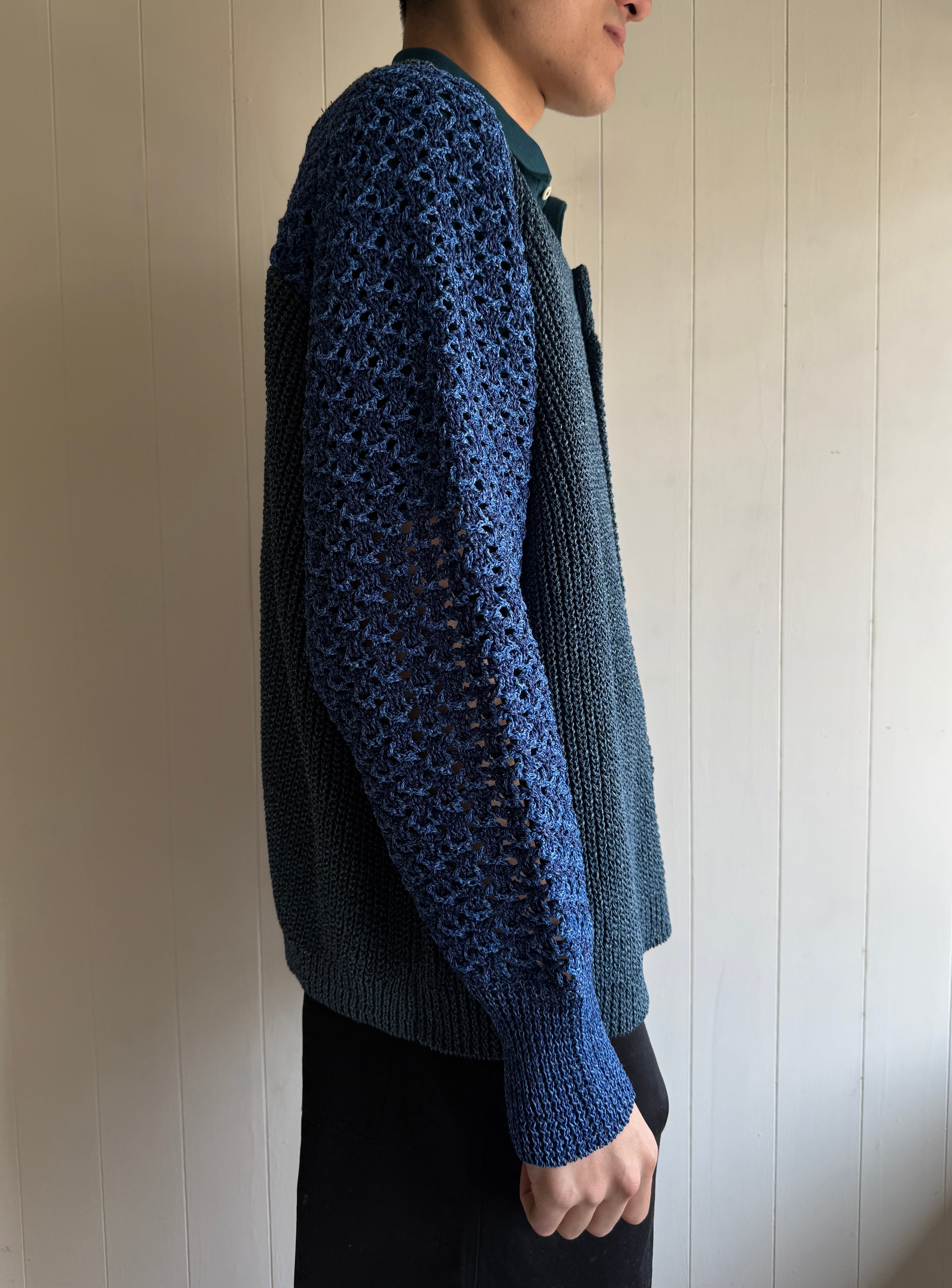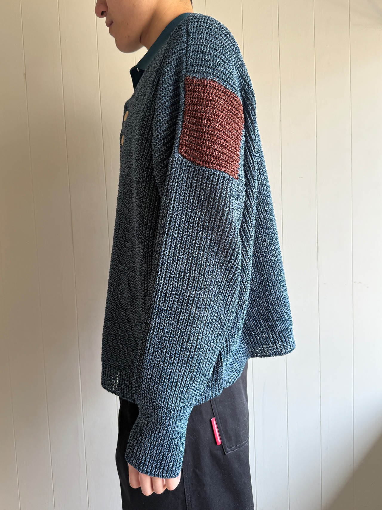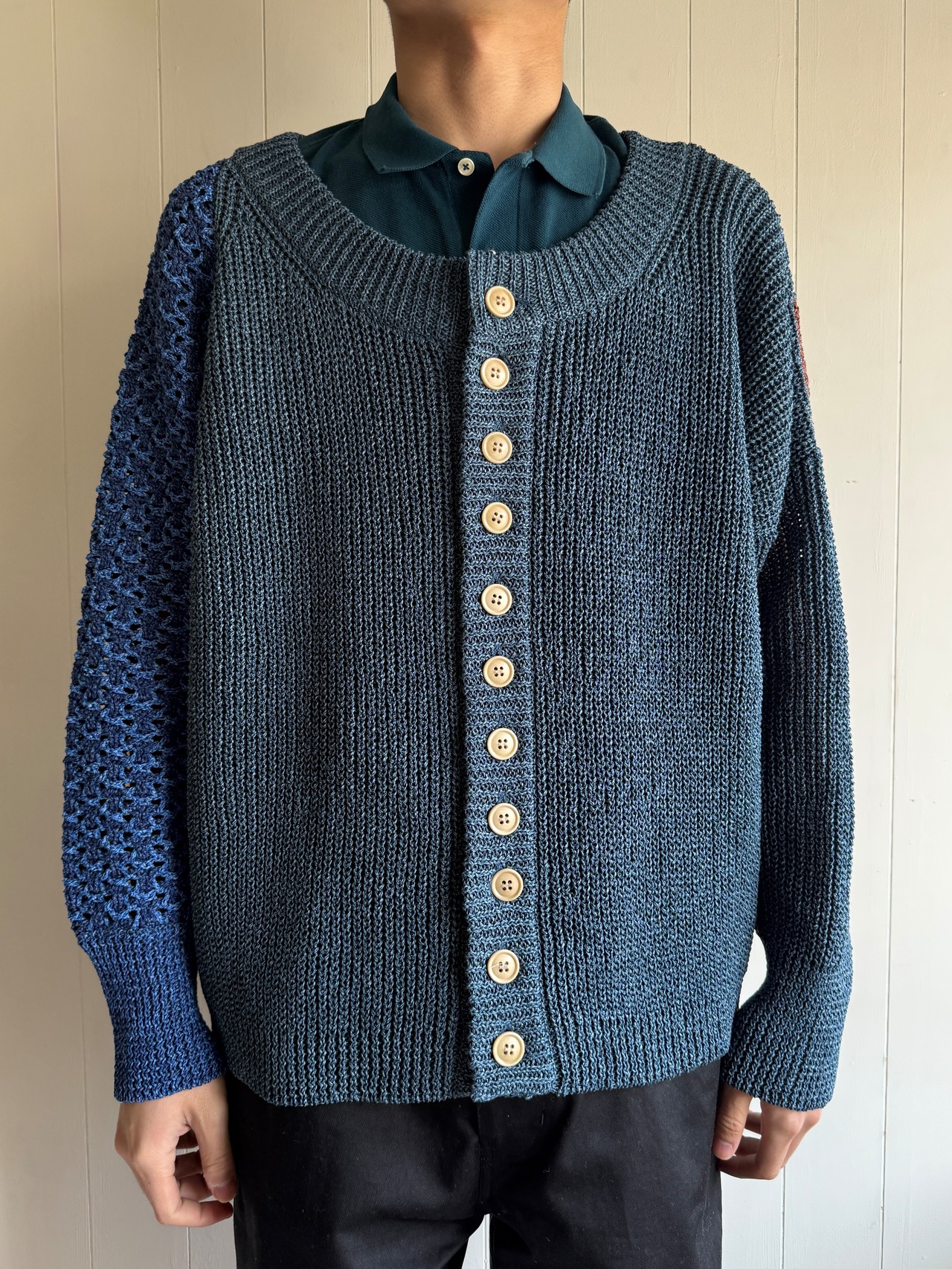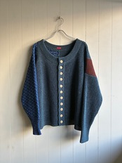 アルチザンなニットです。前ボタンは11個付いており、1つ500円する牛骨ボタンです。ボタンだけで5,500円。凝ってるなぁ。右袖は全て手編みで仕上げられています。少し厨二感のある袖になっていてかっこいいです。左袖は機械編みだそうですが、左肩の後ろの色が切り替えられています。バランス感が絶妙です。
