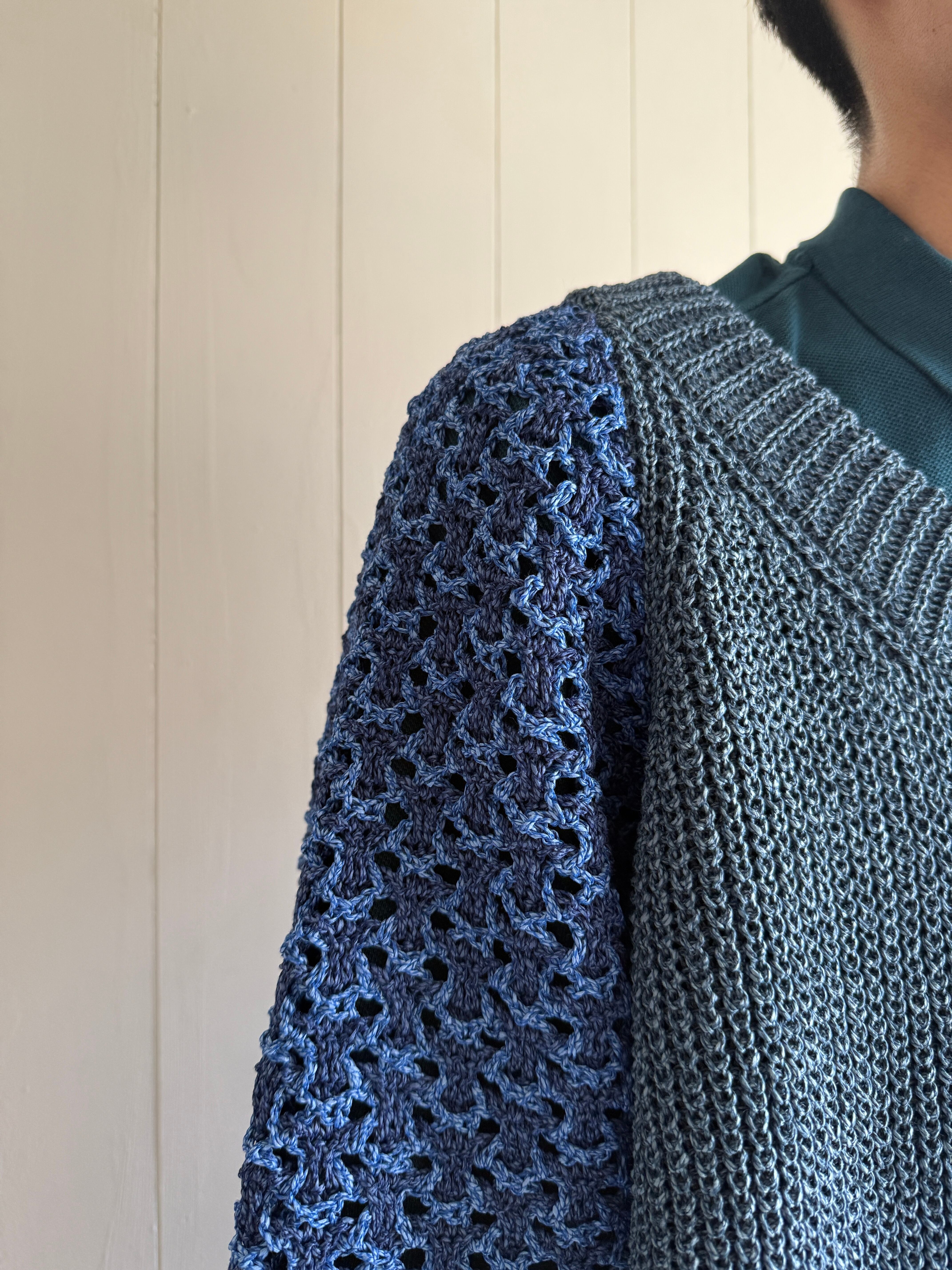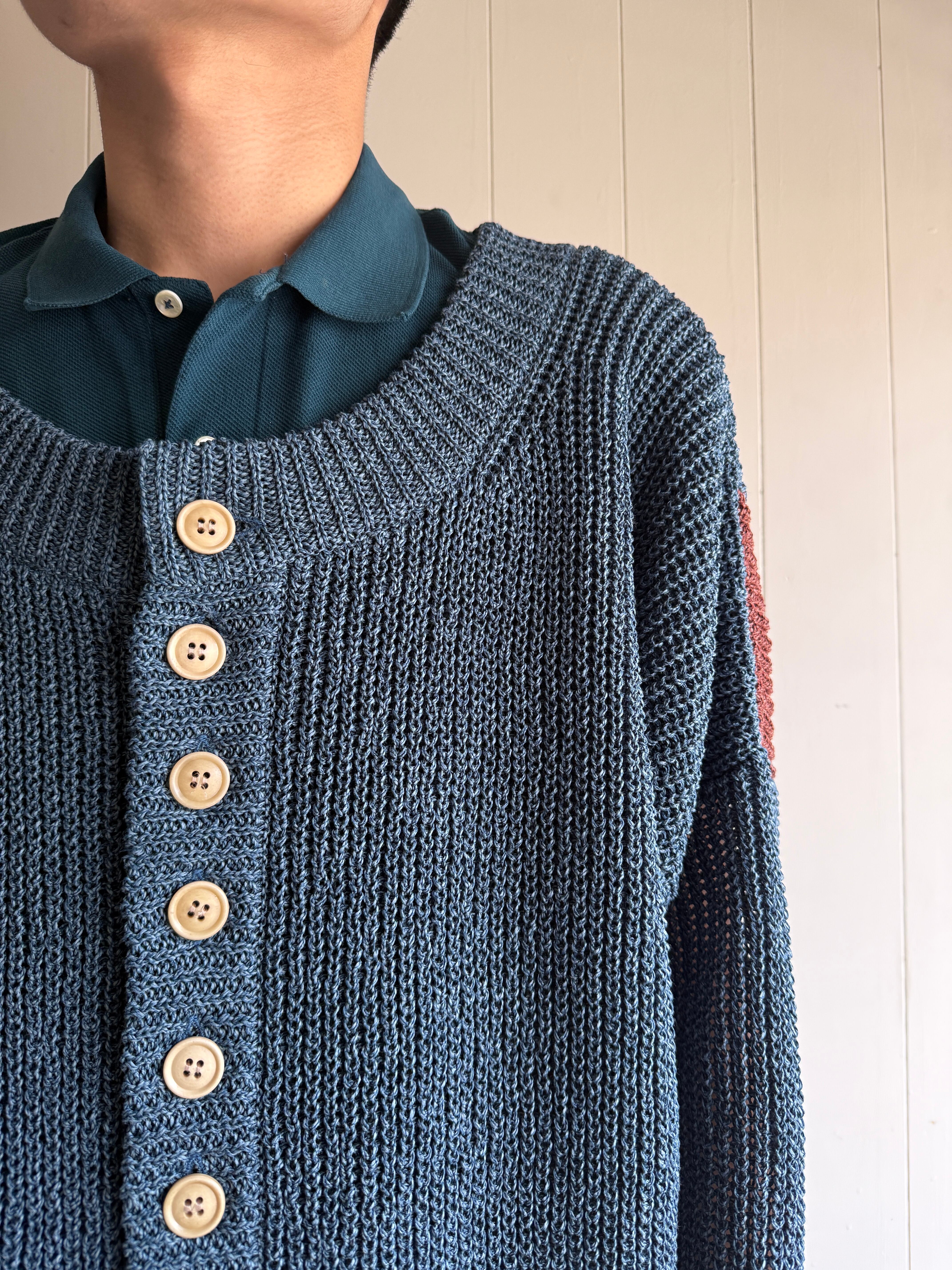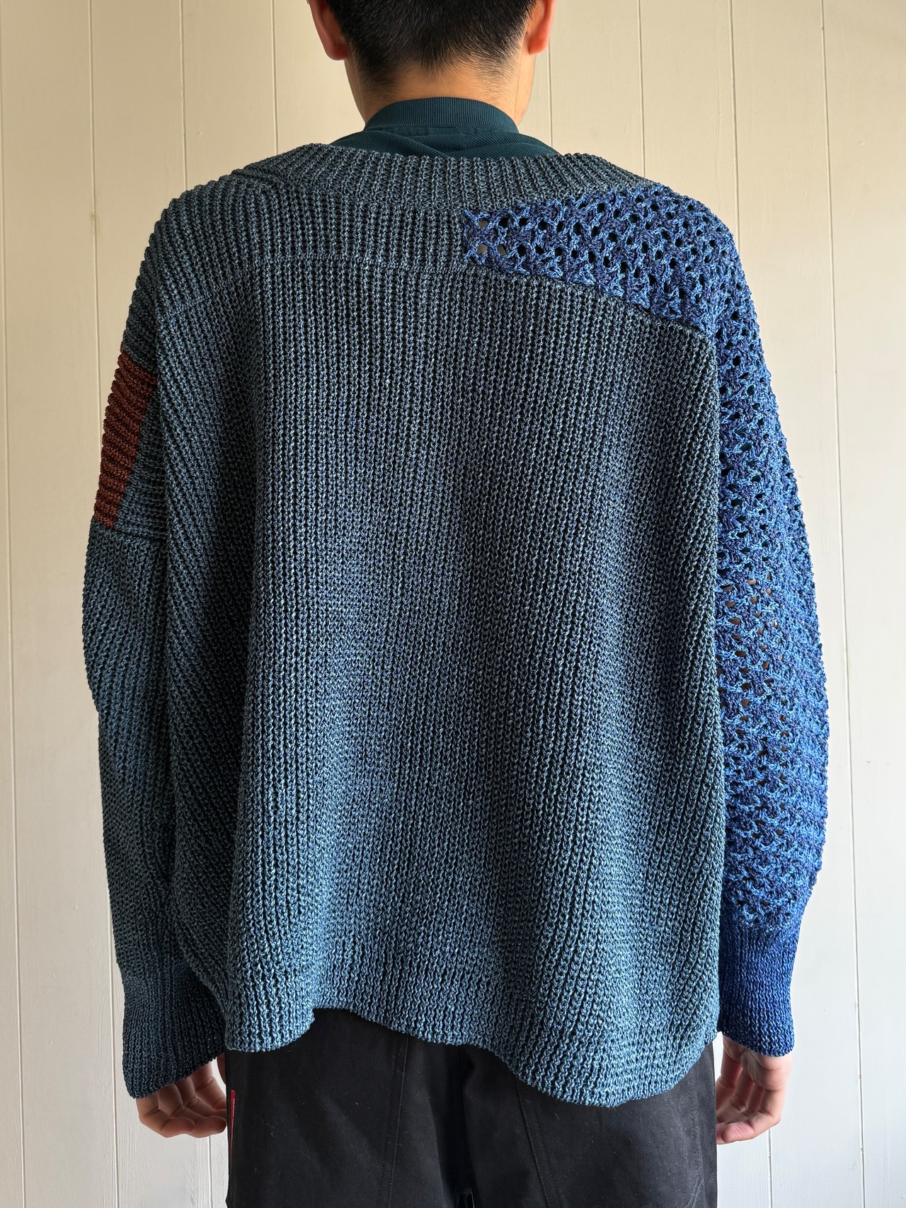 アルチザンなニットです。前ボタンは11個付いており、1つ500円する牛骨ボタンです。ボタンだけで5,500円。凝ってるなぁ。右袖は全て手編みで仕上げられています。少し厨二感のある袖になっていてかっこいいです。左袖は機械編みだそうですが、左肩の後ろの色が切り替えられています。バランス感が絶妙です。