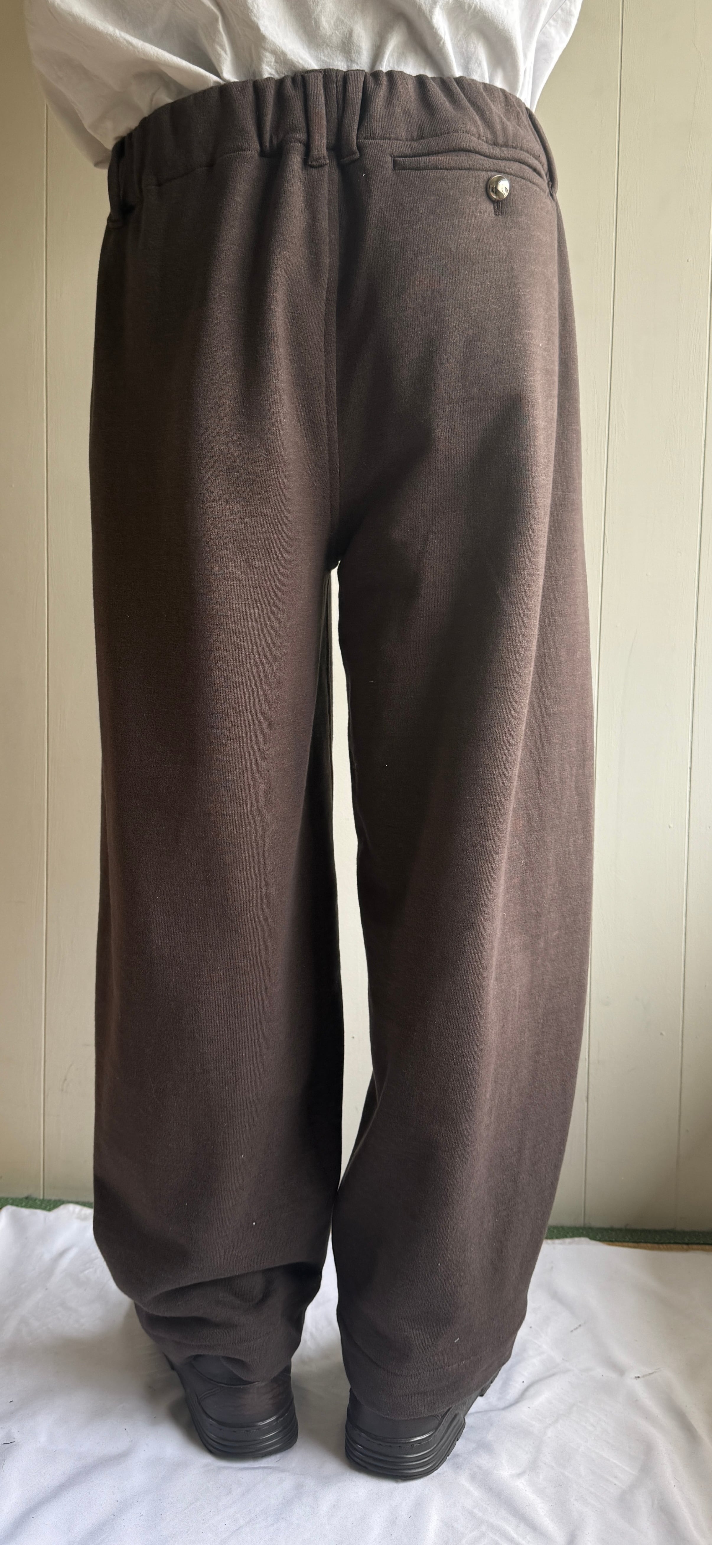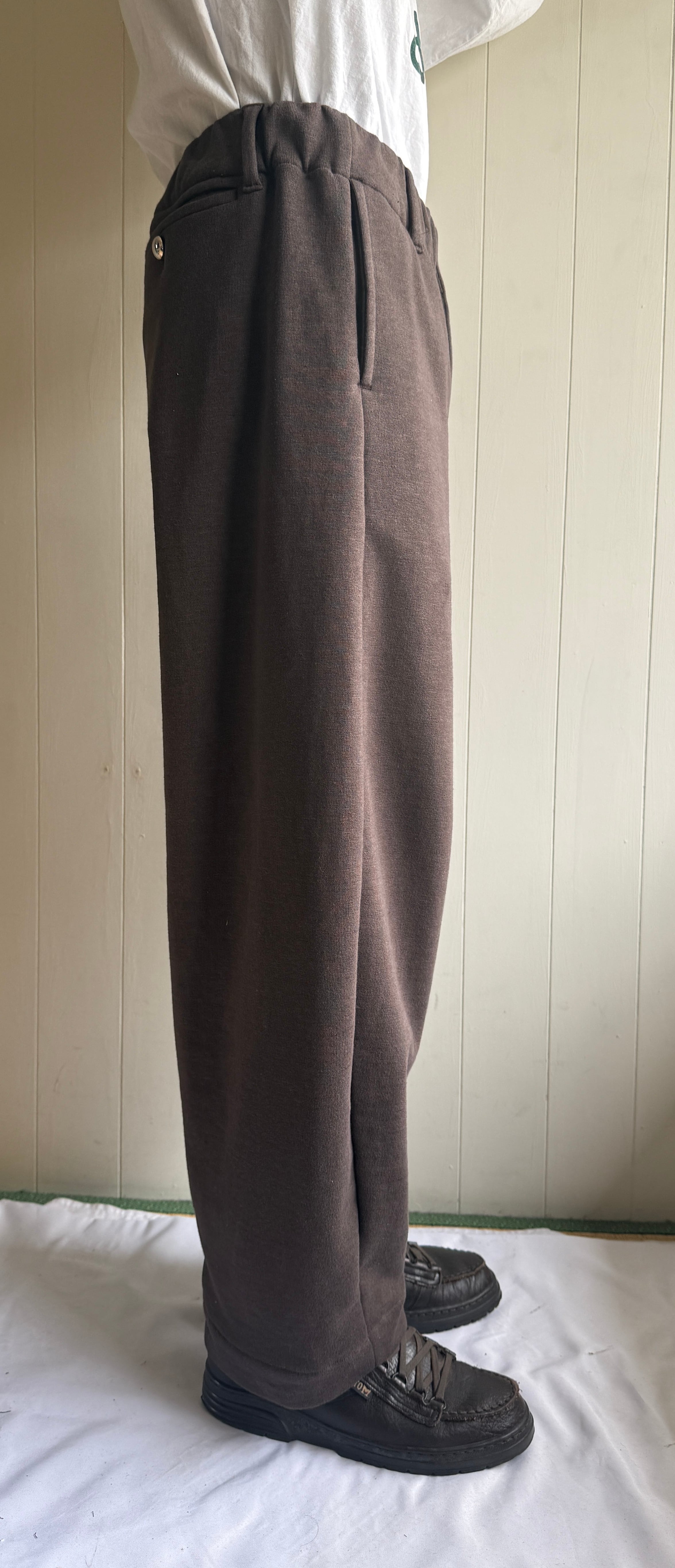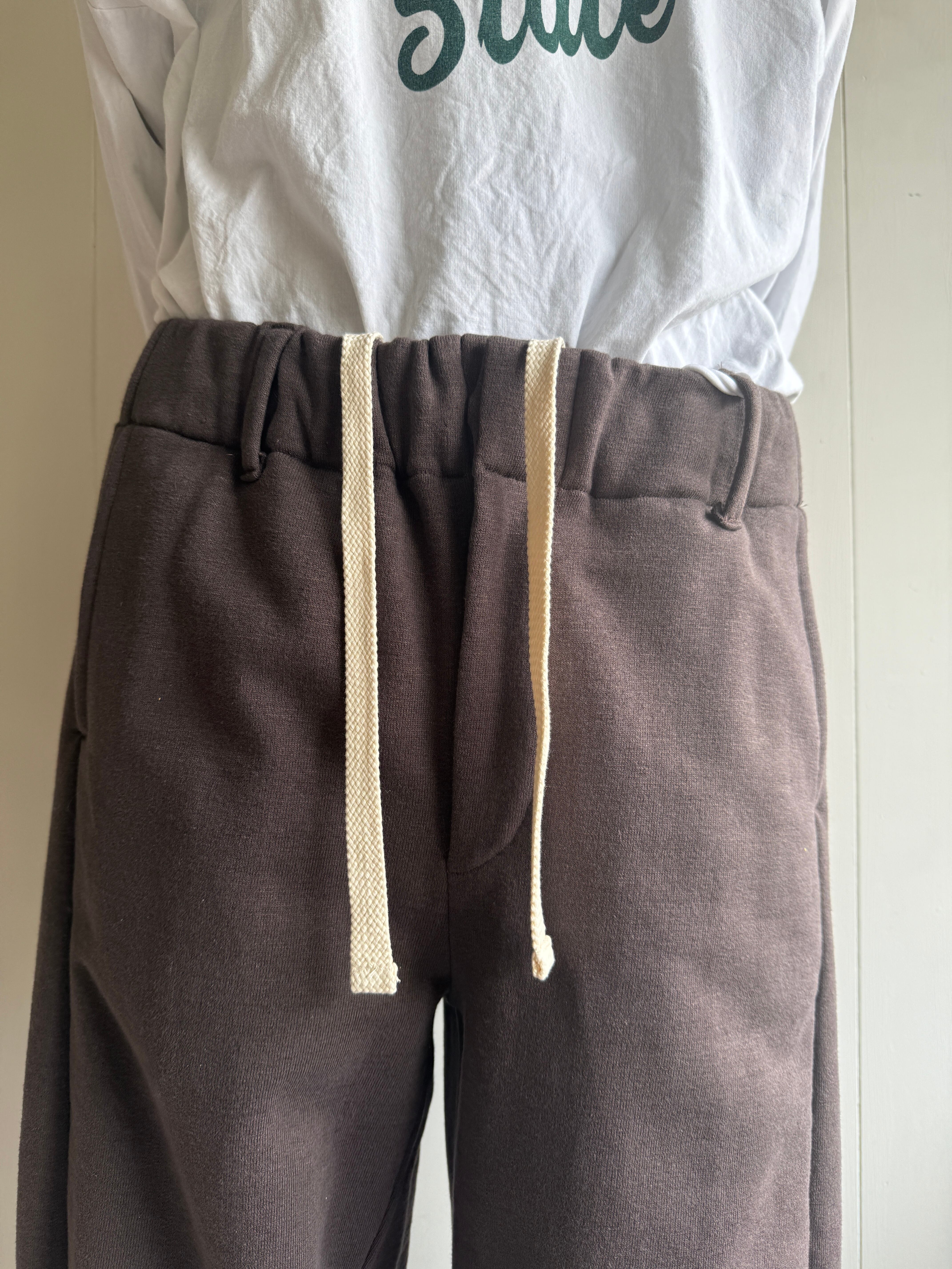 ウエストの調整がゴム、ベルトループ、ドローコードの3つで可能なので誰でも着ることの出来るシルエットがとても綺麗なスウェットパンツです。裏地はパイル地なのでサラッと夏でも履けます。前面の生地が、ソフトにカーブしています。