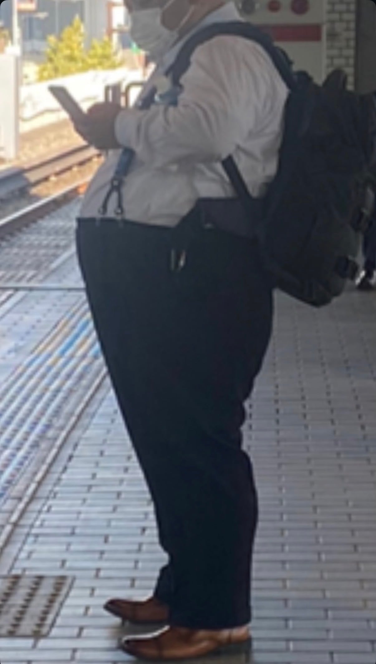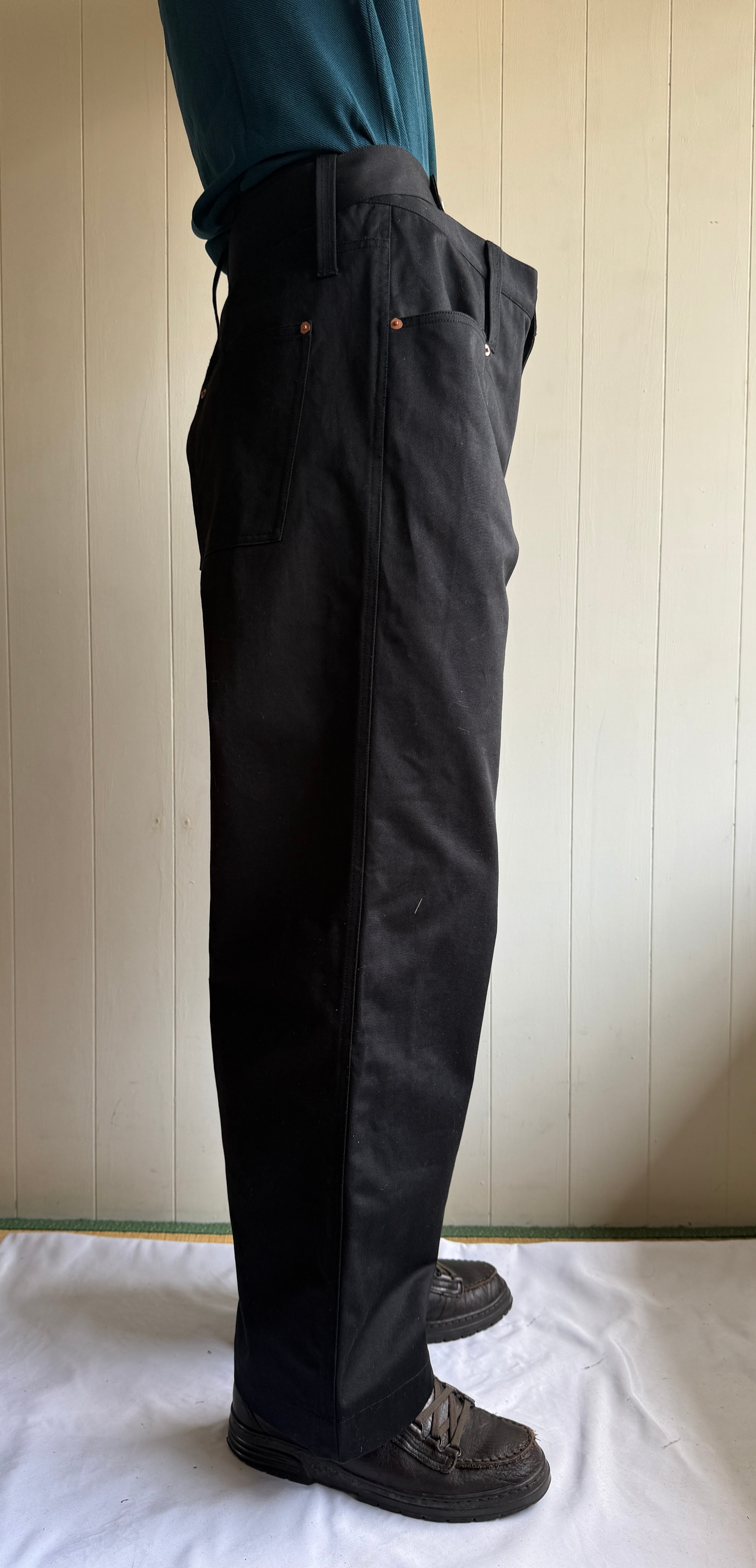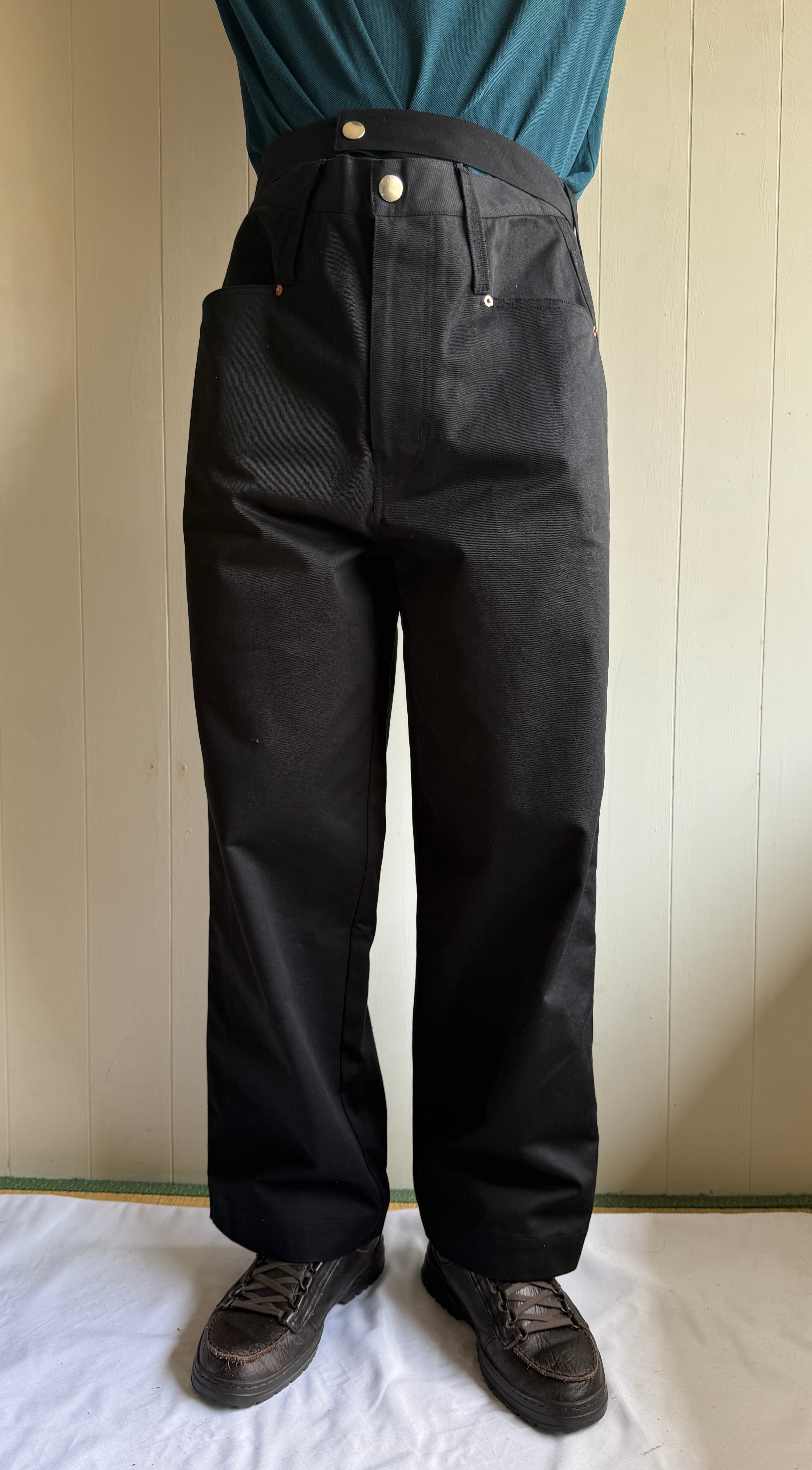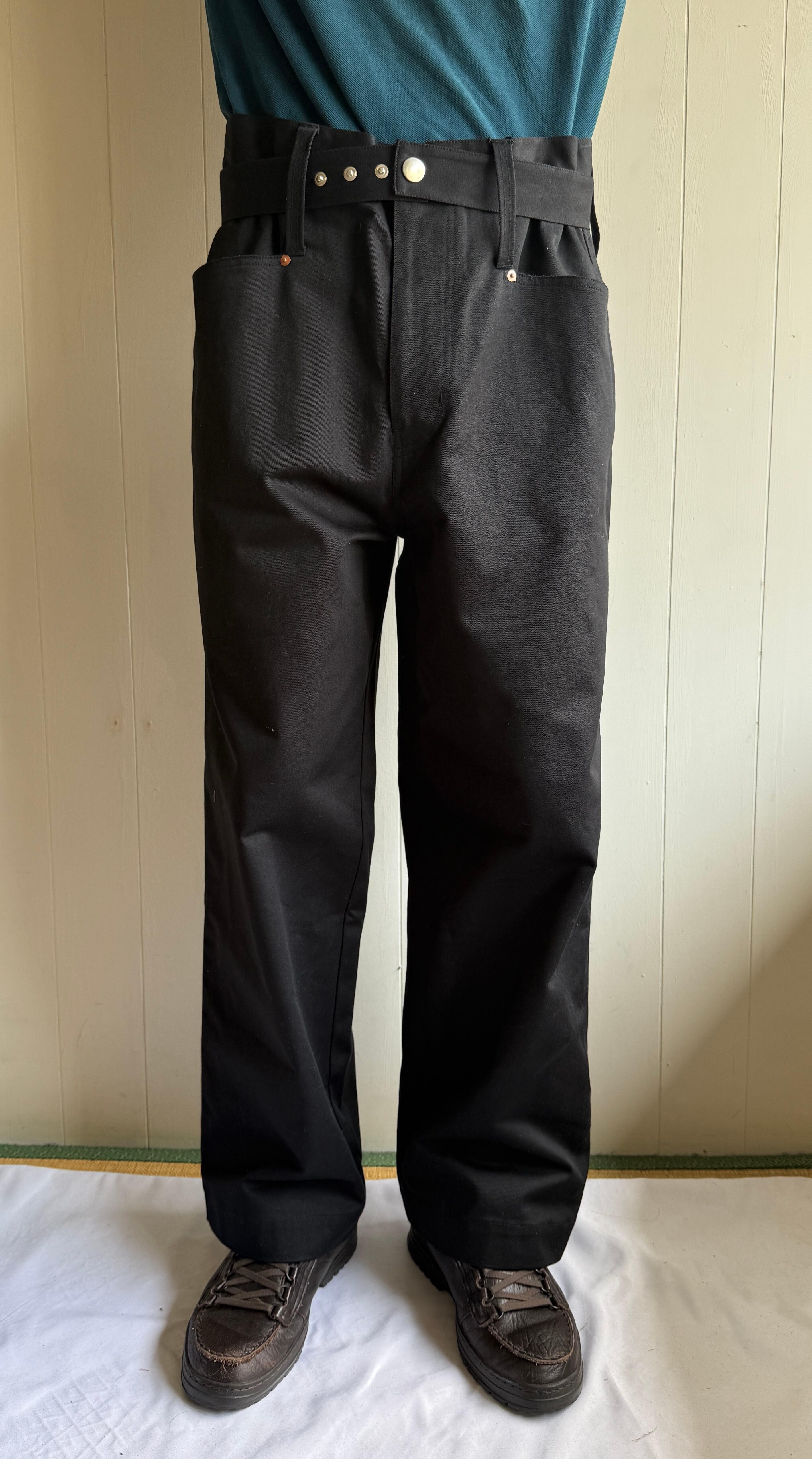 太っている人が履いているパンツのシルエットが好きなデザイナーがそのシルエットを細身の人でも再現出来るようにデザインしたパンツです。トップスをインすると、ベルト部分が強調されるようになっていて、かっこいい。アベリアらしいデザインです。