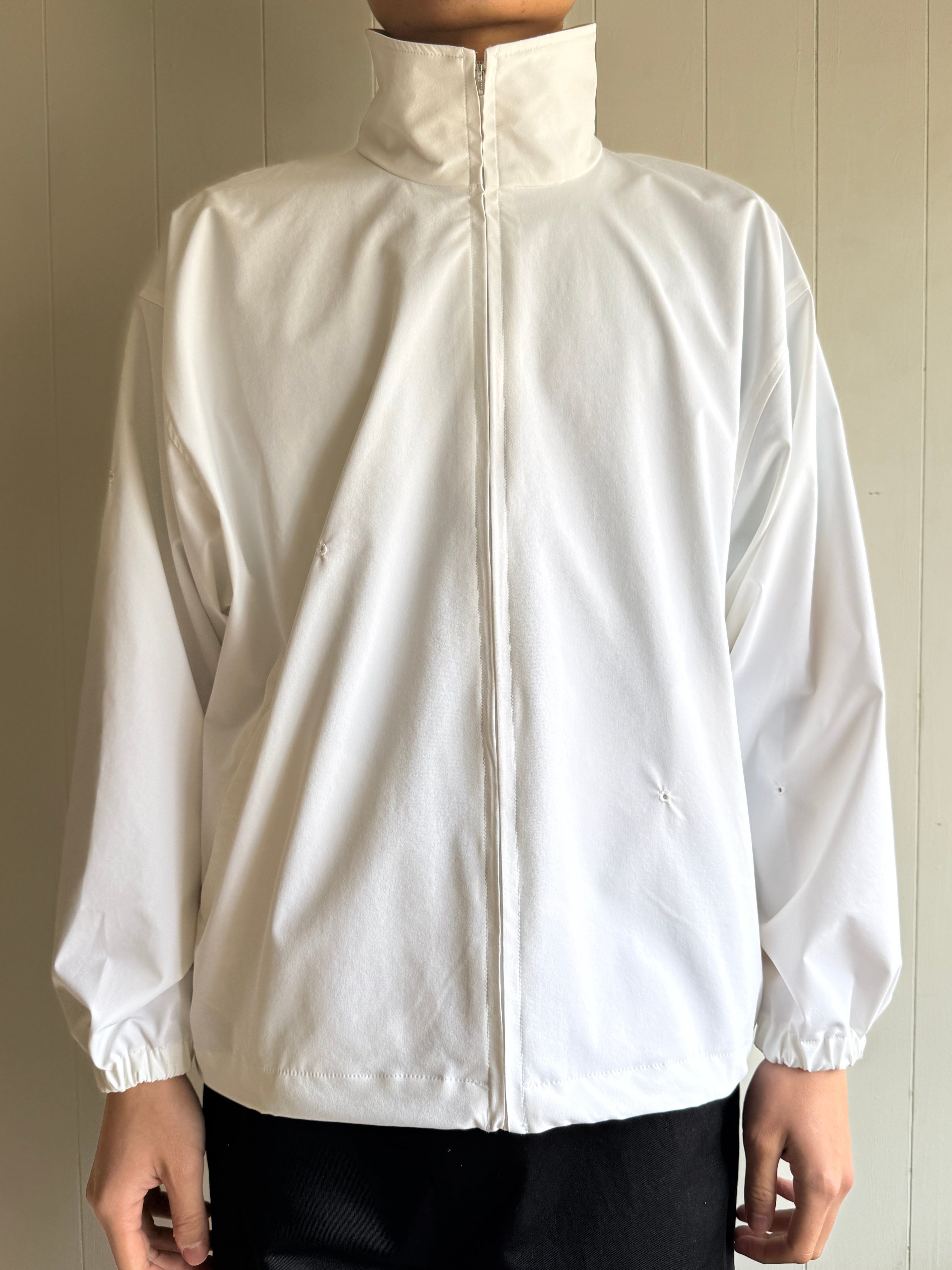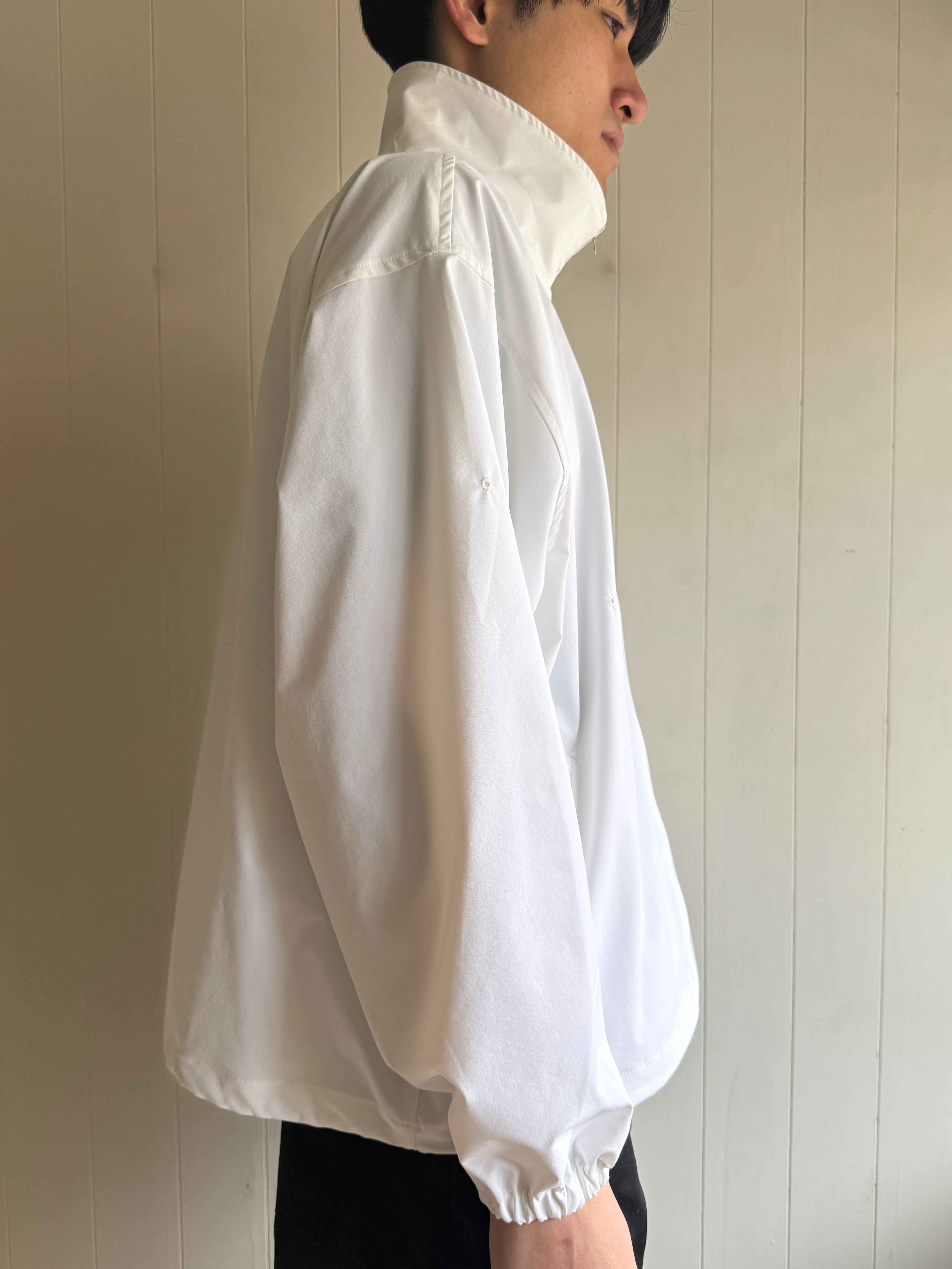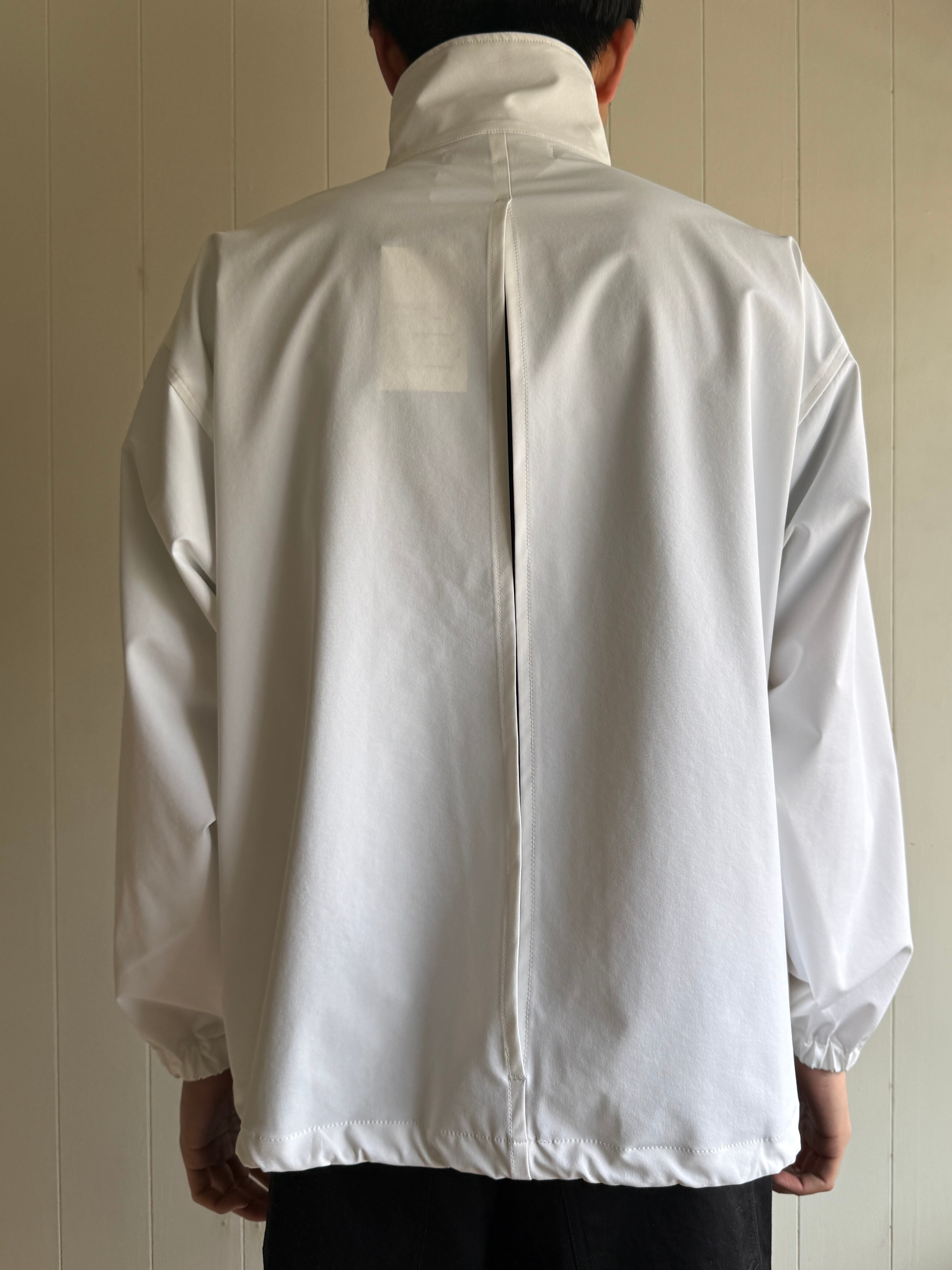 25SSにて新しく作られたスタッフジャンパーの26SSバージョンです。スタッフジャンパーは元々イベントスタッフに支給されるジャケットからインスピレーションを受けてデザインされています。今回のSwimは、26SSで膝上の丈の短いショーツ(水着っぽい)とのセットアップということでSwim Stuff Jumperとなっています。なんといっても、後ろの背中にパックリと穴が空いてるのがかっこいい。